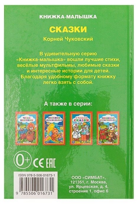 Книга Умка 9785506016731 Сказки. К. Чуковский. Книжка-малышка Комплектация: книга - 1 шт. Состав изделия (материал): картон, бумага Упаковка: нет Размер изделия: 165*215*20 мм, страниц - 48 Тип обложки: твердая ISBN: 9785506016731 Автор: К. И. Чуковский Издательство: Умка книги Страна обладатель бренда: Россия Это издание представляет собой сборник из известных сказок в стихах Корнея Чуковского, которые олицетворяют собой торжество доброты, справедливости и красоты. Ваш ребёнок обязательно оценит такой замечательный подарок. Дети любят сказки, ведь в них добро всегда побеждает зло, а истории всегда хорошо заканчиваются. Ваш малыш вместе со сказочными героями перенесется в волшебный мир сказок. Сказки - это и уроки доброты, милосердия, справедливости. Они учат детей проявлять житейскую мудрость, отличать добро от зла и помогут формировать другие положительные качества. Читать книги детям полезно с самого раннего возраста. Это стимулирует их воображение, позволяет успокоить и разнообразить досуг.