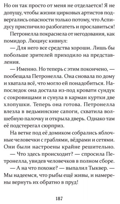 В этой книге добрую маленькую ведьму Петронеллу и её друзей Луиса и Лину ждут необычные приключения! В их городок на гастроли приехал цирк. Лина и Луис познакомились с ребятами из труппы и проникли за кулисы. К своему ужасу, они обнаружили, что артисты цирка не довольны своей жизнью, директор всё время спит, а всем заправляет злой маг и фокусник. Может быть, Петронелла сумеет им помочь?