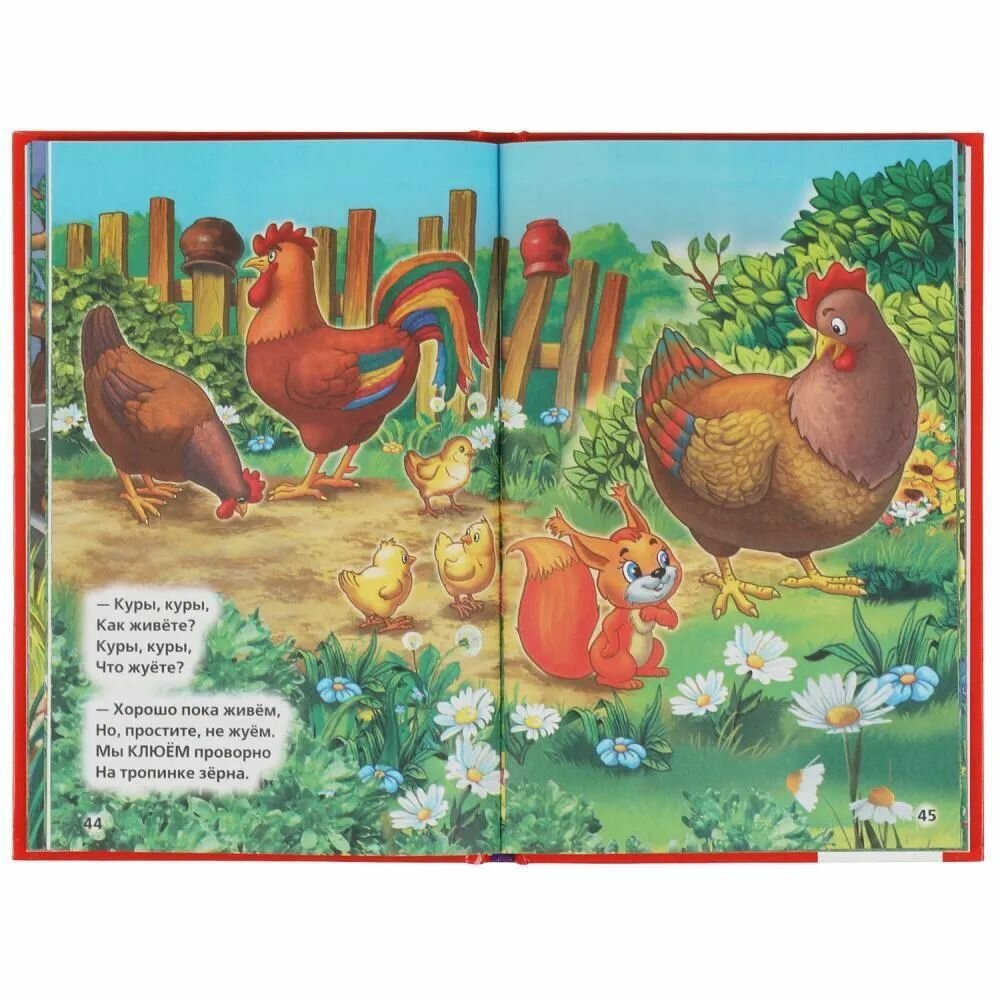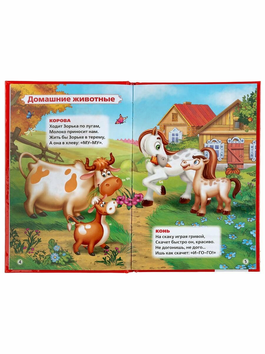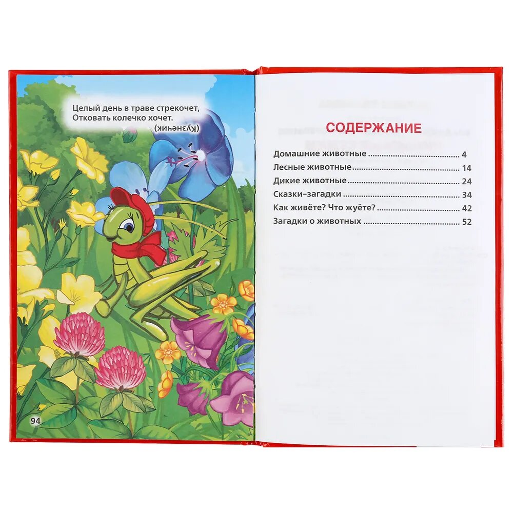 По содержанию, книжка включает в себя: стихи про домашних, диких и лесных животных и их питание, а также загадки по русским народным сказкам и про животных. К покупке рекомендую!