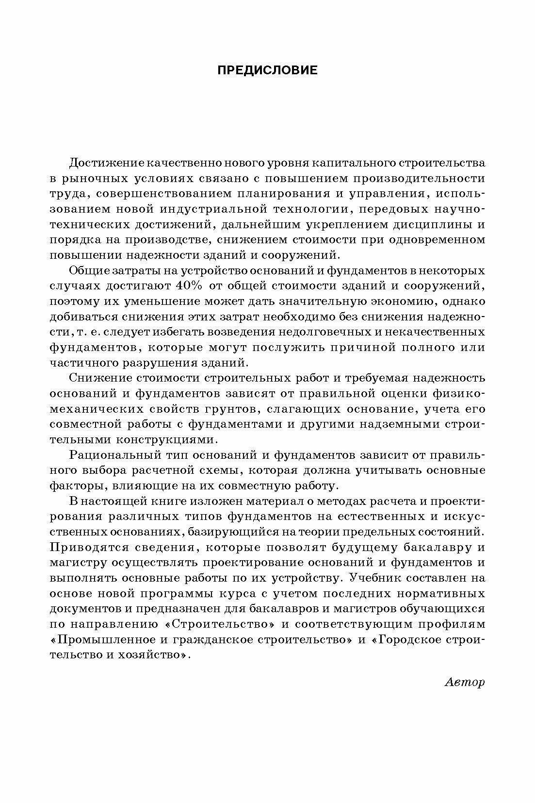 В книге приведены методы и примеры расчета оснований и фундаментов по предельным состояниям первой и второй групп. Рассмотрены фундаменты различных типов: для открытых котлованов, свайные, глубокого заложения, на структурно-неустойчивых грунтах. Даны сведения по реконструкции фундаментов зданий и сооружений. Приводятся основные положения правил конструирования фундаментов.