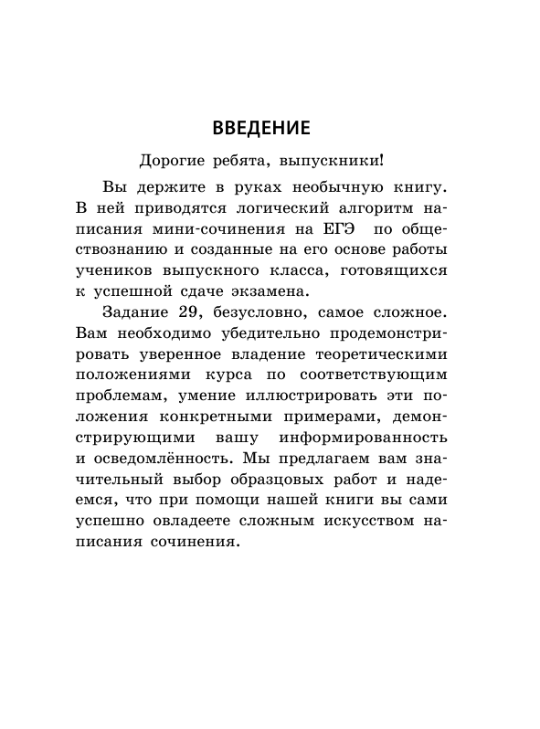 Пособие содержит пошаговые рекомендации по написанию мини-сочинения на ЕГЭ по обществознанию (задание 29) и образцовые работы по пяти содержательным блокам: "Философия", "Экономика", "Социология, социальная психология", "Политология", "Правоведение". Книга поможет учащимся научиться раскрывать смысл предложенных высказываний, используя обществоведческие понятия, приводить факты и примеры из различных источников и писать сочинения на высший балл.