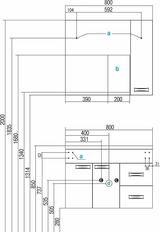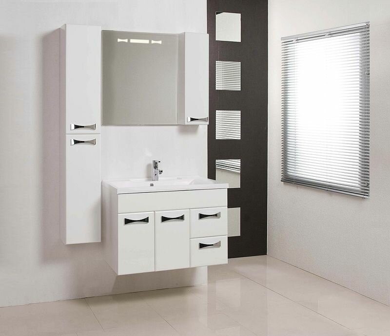 - зеркало, светильник 1 шт, выключатель 1 шт, шкаф, ручка 1 шт, держатели полок 8 шт, стеклянные полки 2 шт.