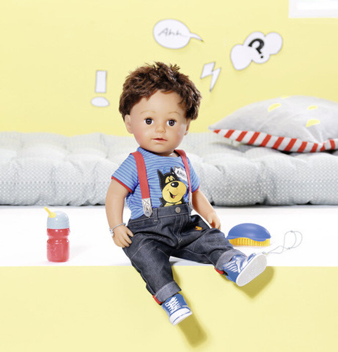 У Братика смуглая кожа, карие глаза, мягкие волосы, которые можно расчесывать (расческа входит в комплект), подвижные ручки и ножки, сгибающиеся в коленях. Кукла умеет стоять, пить из бутылочки (входит в комплект) и плакать. А еще его можно купать!