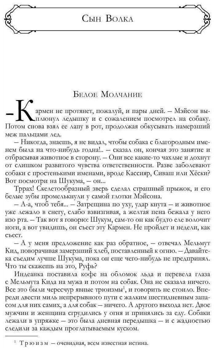 Радовалась, что наконец нашлась книга, в которой в одном томе собраны рассказы Джека Лондона (в детстве была аналогичная книга, но зачитана уже до дыр), да и оформление и качество данного издания на высоте. Но как только начала читать, разочарованию не было предела: ужасный перевод! Все географические названия (Бонанца вместо Бонанза, Тананау вместо Танана и многие другие) переведены так, будто переводчик их до этого ни разу в жизни не слышал! А имена - это вообще что-то с чем-то: Заринска вместо Заринка (видимо дочь вождя польского происхождения), Луи Савуа вместо Луи Савой (тут вообще не понятно откуда у француза фамилия СавуА). Но больше всего убило: иглОО вместо ИГЛУ... Ну как такой перевод можно печатать? Редакторы совсем не знают ничего? Горечь разочарования...