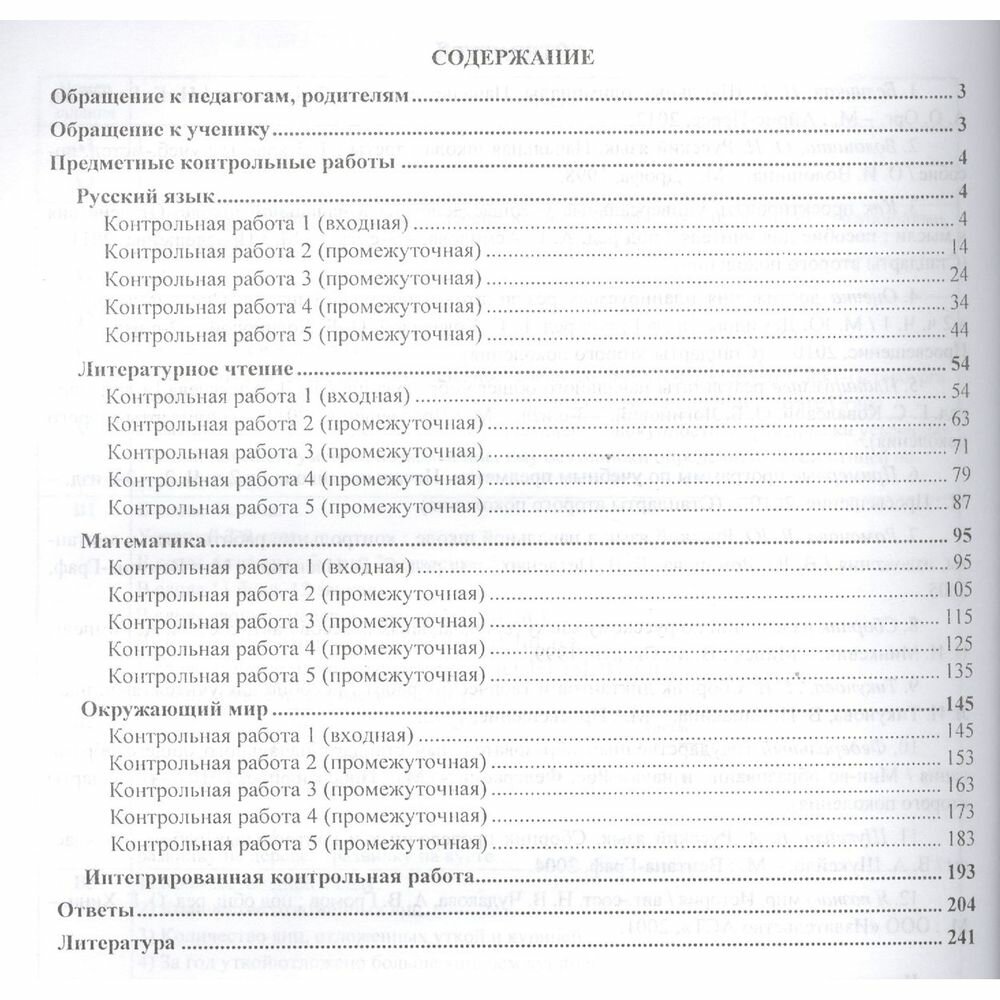 В пособии предложены контрольные работы с ответами по русскому языку, литературному чтению, математике, окружающему миру для 3 класса, составленные в соответствии с ФГОС НОО и представленные в форме тестов с разноуровневыми заданиями. Определить уровень сформированности предметных и метапредметных результатов обучения, проследить их динамику учителю помогут листы самооценки и саморефлексии обучающихся, итоговые таблицы с критериями для оценивания.