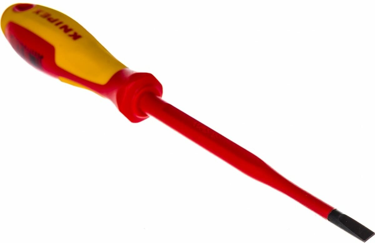 **Отвертка диэлектрическая Knipex** применяется при проведении ремонтных работ. Подходит для монтажа электрического оборудования, подключения счетчика. Имеет плотную изоляцию. Защитит от удара током, в том числе при попадании в обычную фазу. Ручка прямой формы сделана из двухкомпонентного пластика. Полотно изготовлено из стали, устойчивой к коррозии и воздействию влаги.