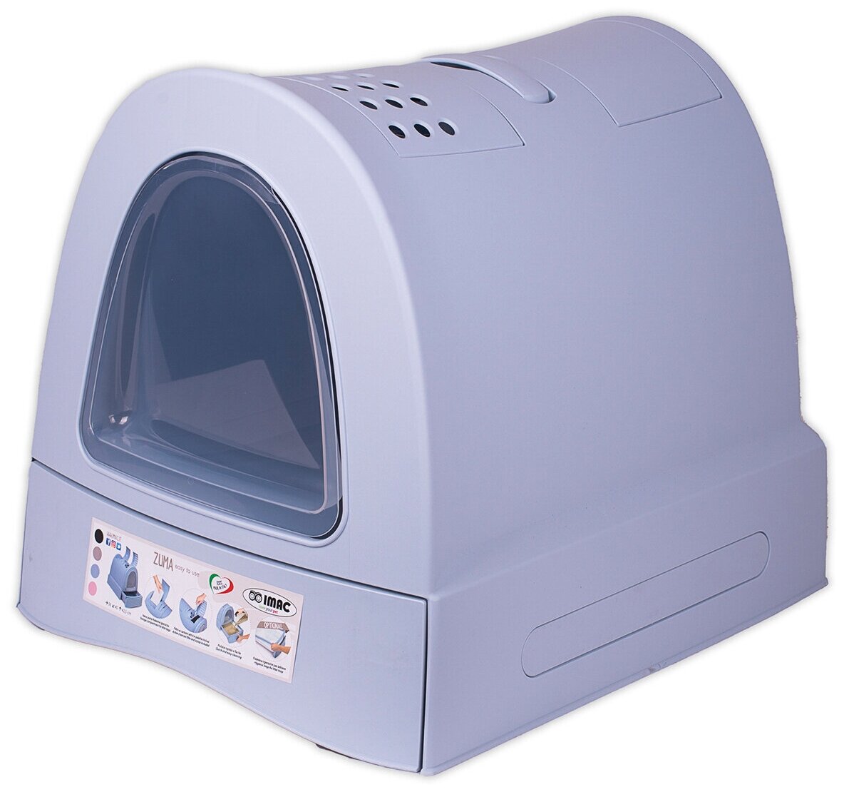 Итальянский бренд Imac представил туалет для кошек Zuma объединивший в себе стильный дизайн и функциональные преимущества. Лоток со съёмной рамой для установки гигиенического мешка, оптимальный размер 40*56*42,5 см, выдвижная ручка, фильтр из активированного угля и совок в комплекте, а также отделение для хранения гигиенических мешков. Модель представлена в трёх цветах пастельной гаммы в духе современных тенденций интерьера.