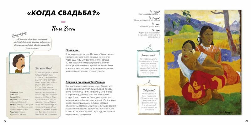 Каждое произведение искусства вписано в контекст своей эпохи. Чтобы понять связь произведения со временем и его создателем, вы найдете немало исторической информации: биографию художника, историю создания картины, особенности эпохи и многое другое. Каждую картину вы сможете рассмотреть в деталях, а вопросы помогут задуматься над смыслом произведения. Также на каждой странице вас ждет небольшой забавный комикс!