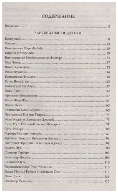 Книга построена не алфавитным указателем имён, как это чаще всего бывает, а от имён древности до сегодняшних дней, с отделением зарубежных педагогов от отечественных. Это тем более удобно, что в любом случае наша педагогика является самой молодой, и она закономерно идёт после общемировой. Выборка сделана от Конфуция, т.е. охватывается период 400-х г.г. до н.э., практически от первых школ в Китае, до наших современников, педагогов-новаторов, это известные имена, некоторые из них ещё живы (такие как Шалва Амонашвили и Виктор Шаталов), другие умерли не так давно (Караковский В.А., Волков И.П., Никитины Л.А. и Б.П., С.Л. Соловейчик, С.Н. Лысенкова). Также упомянуты и относительно молодые педагоги-новаторы, примерно с четвертьвековым педагогическим опытом (А.Адамский, Г.Алёшина).