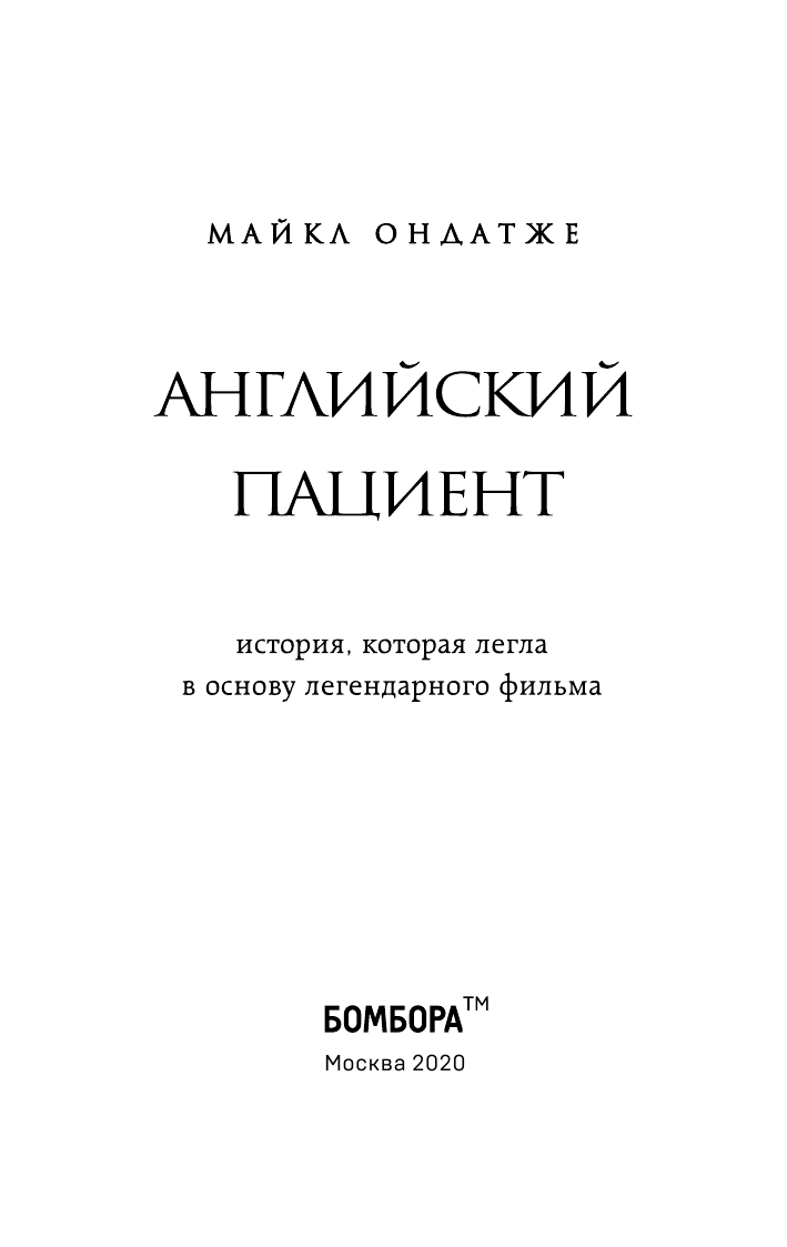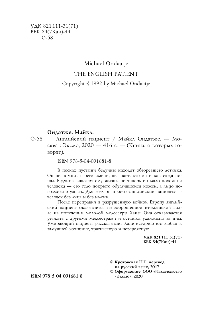Книга: Английский пациент (Кротовская Наталья Георгиевна (переводчик), Ондатже Майкл); Эксмо, 2018