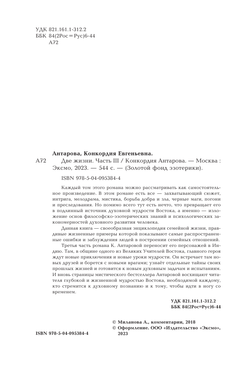 Захватывающий сюжет и практическое Учение Жизни в одной книге - это сочетание сделало "Две жизни" Антаровой бестселлером и культовой книгой, армия поклонников которой неуклонно возрастает. Книга адресована самому широкому кругу читателей: любителям мистической прозы и приключений, поклонникам духовной мудрости Востока, а в особенности тем, кого интересуют практические вопросы самопознания и духовной самореализации.