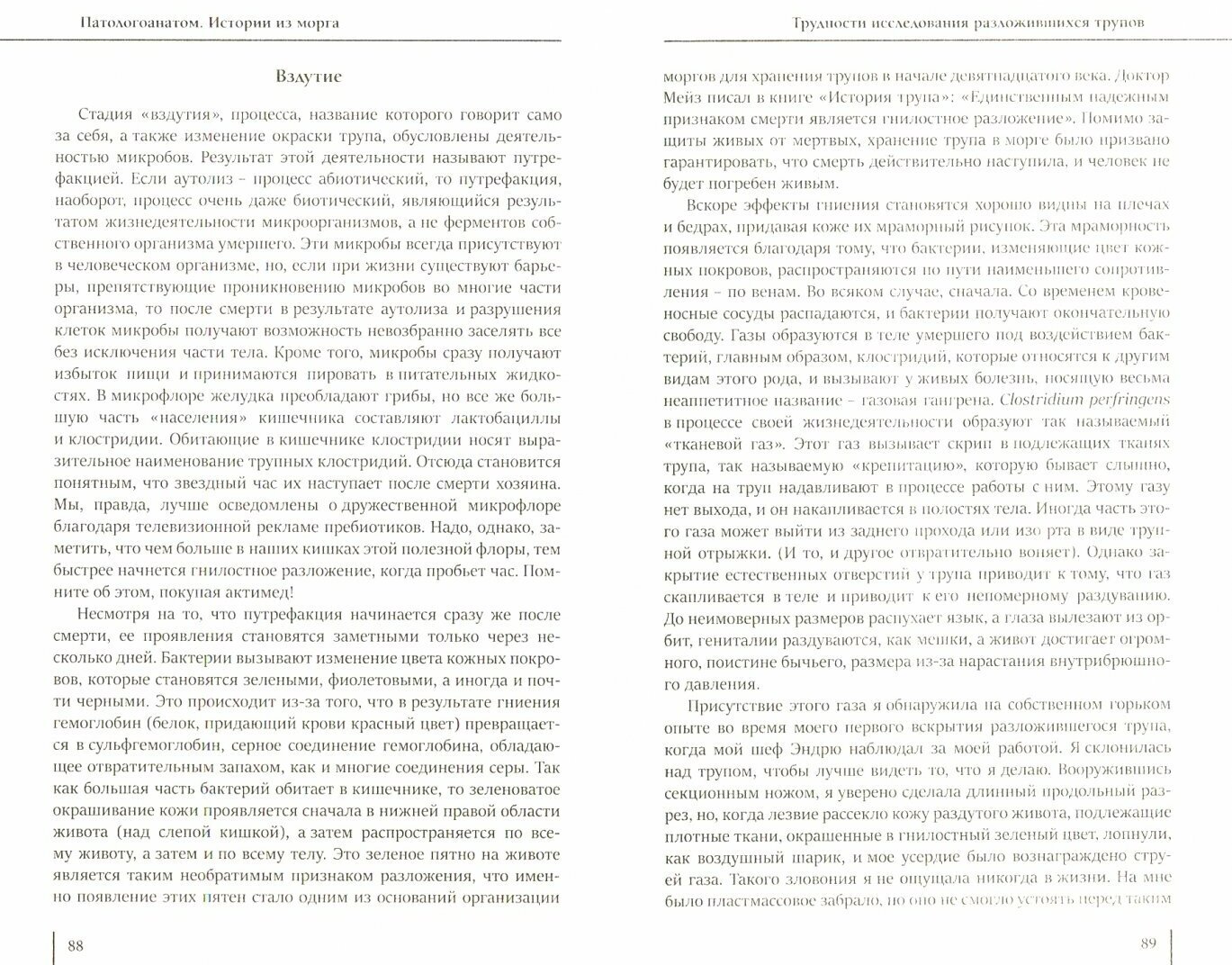 Купила книгу, ожидая прочитать историю врача. Я,являясь студенткой медицинского ВУЗа, знаю, что работа патологоанатома заключается не только в проведении вскрытий людей умерших не насильственной смертью (что отличает их от суд. мед. экспертов), но и микроскопическому исследованию образцов тканей живых пациентов в том числе. Но, к сожалению для меня, девушка не является врачом. Она работала техником морга и её задача была проводить вскрытия и брать образцы на исследование. В Великобритании этим занимается отдельный человек с высшим образованием, сертификатом и т.д. У нас в России либо сам доктор, либо санитар. Но автор и не претендовала на должность врача: её книга в оригинале называется “Past Mortems”, а русификация исказила смысл. На протяжении всей книги описываются этапы вскрытия и параллельно истории из жизни. Неплохая книга, автор откровенна с читателем, но название вводит в заблуждение, кроме того, имеются досадные опечатки и некоторые сноски находятся не на своём месте(((