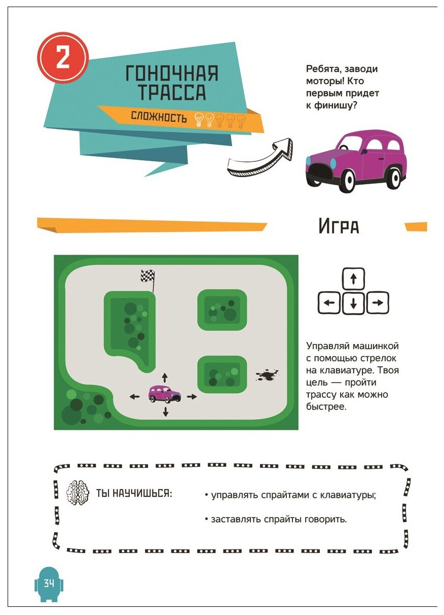 Отличная книжка, с которой может разобраться ребёнок без взрослого. Яркие иллюстрации, интересные сюжеты, возможность проверить себя, возможность усовершенствовать скрипт. Здорово что с самого начала в книге указаны все ссылки на программы и доп утилиты. Ну а про развитие логического мышления, развитие навыка выстраивания алгоритмических цепочек и осознание причинно-следственной связи и говорить не стоит.