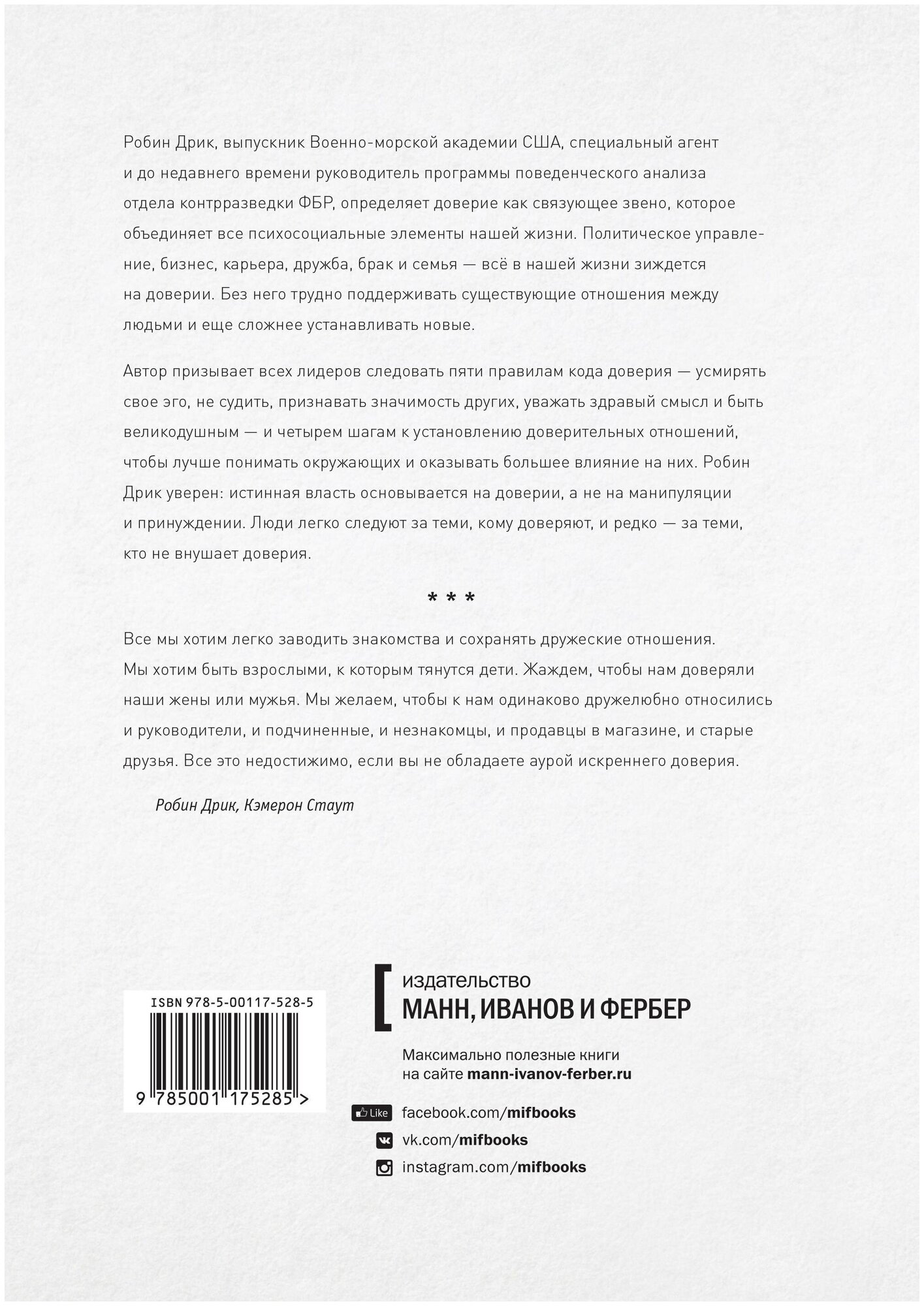 Строим доверие по методикам спецслужб (Стаут Кэмерон (соавтор), Головина Людмила С. (переводчик), Дрик Робин); Манн, Иванов и Фербер, 2018