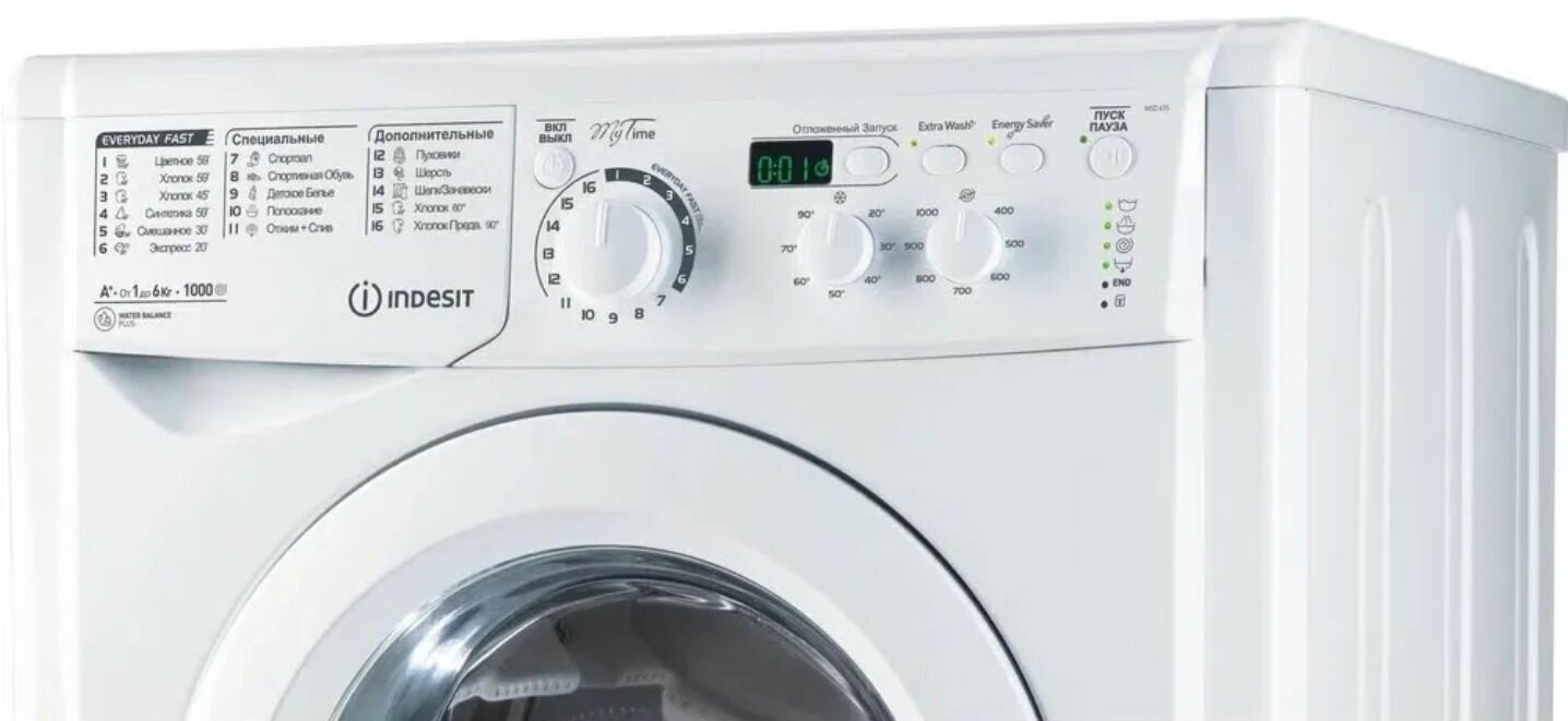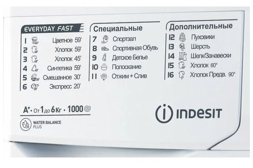 Стиральная машина Indesit с отжимом в 1000 об/мин вмещает 6 кг белья путем фронтальной загрузки. По энергопотреблению отнесена к классу А.