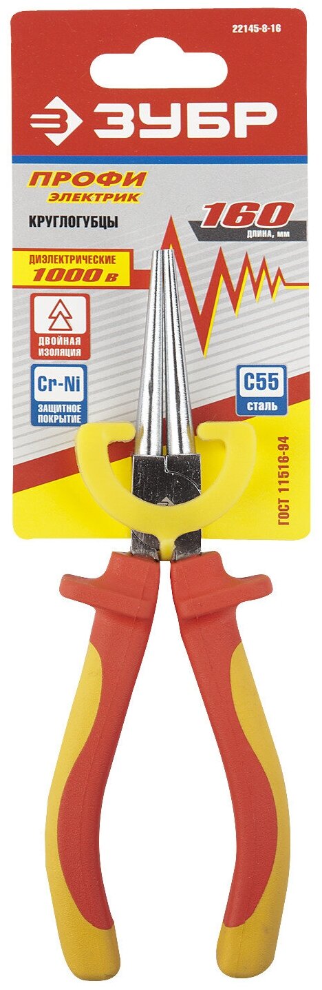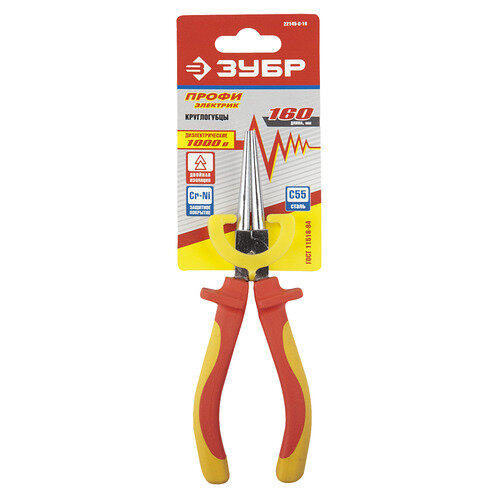 Круглогубцы Зубр , диэлектрические, двухкомпонентная маслобензостойкая рукоятка, до ~1000В, 160мм