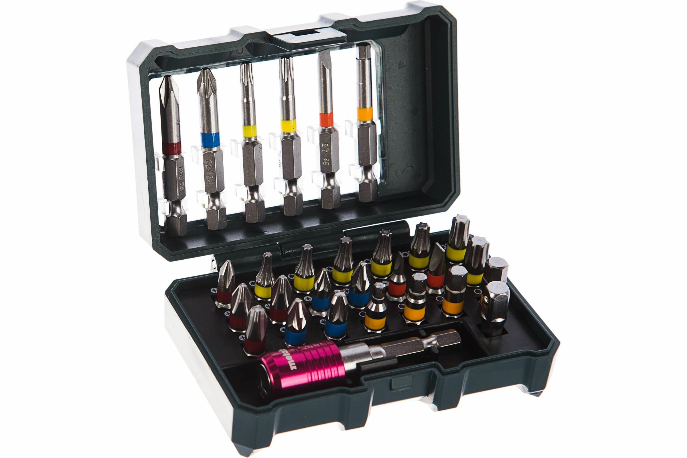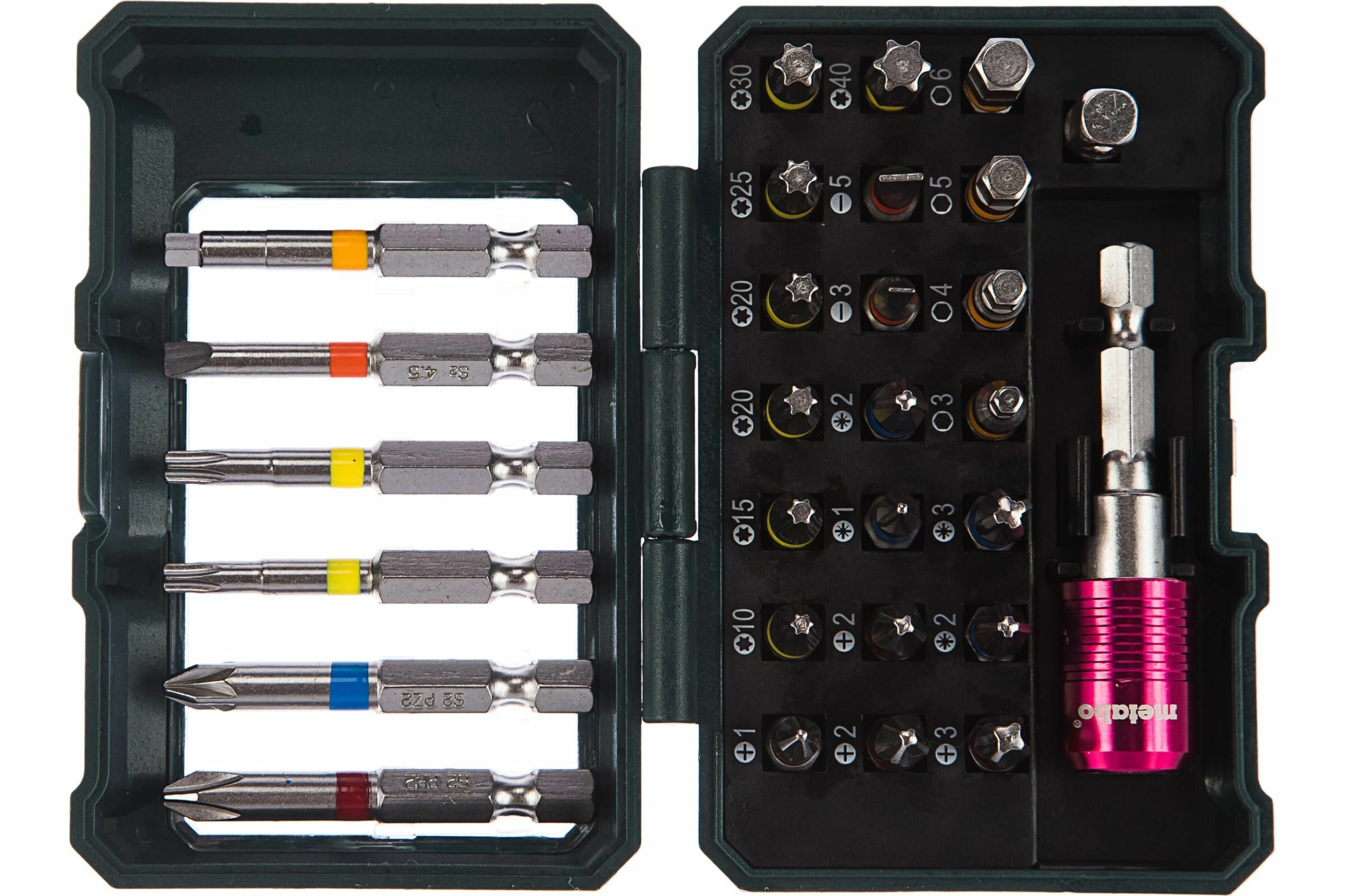 | Биты | L= 25 мм (21 шт.):PH 1 x 1, PH 2 x 2, PH 3 x 1; PZ 1 x 1, PZ 2 x 2; PZ 3 x 1; SL 3 x 1, SL 5 x 1; H 3 x 1, H 4 x 1, H 5 x 1; H 6 x 1; T 10 x 1, T 15 x 1, T 20 x 2, T 25 x 1, T 30 x 1, T 40 x 1;,L= 50 мм (6 шт.):PH 2 x 1; PZ 2 x 1; T 20 x 1, T 25 x 1; SL 4,5 x 1, H 4 x 1. |