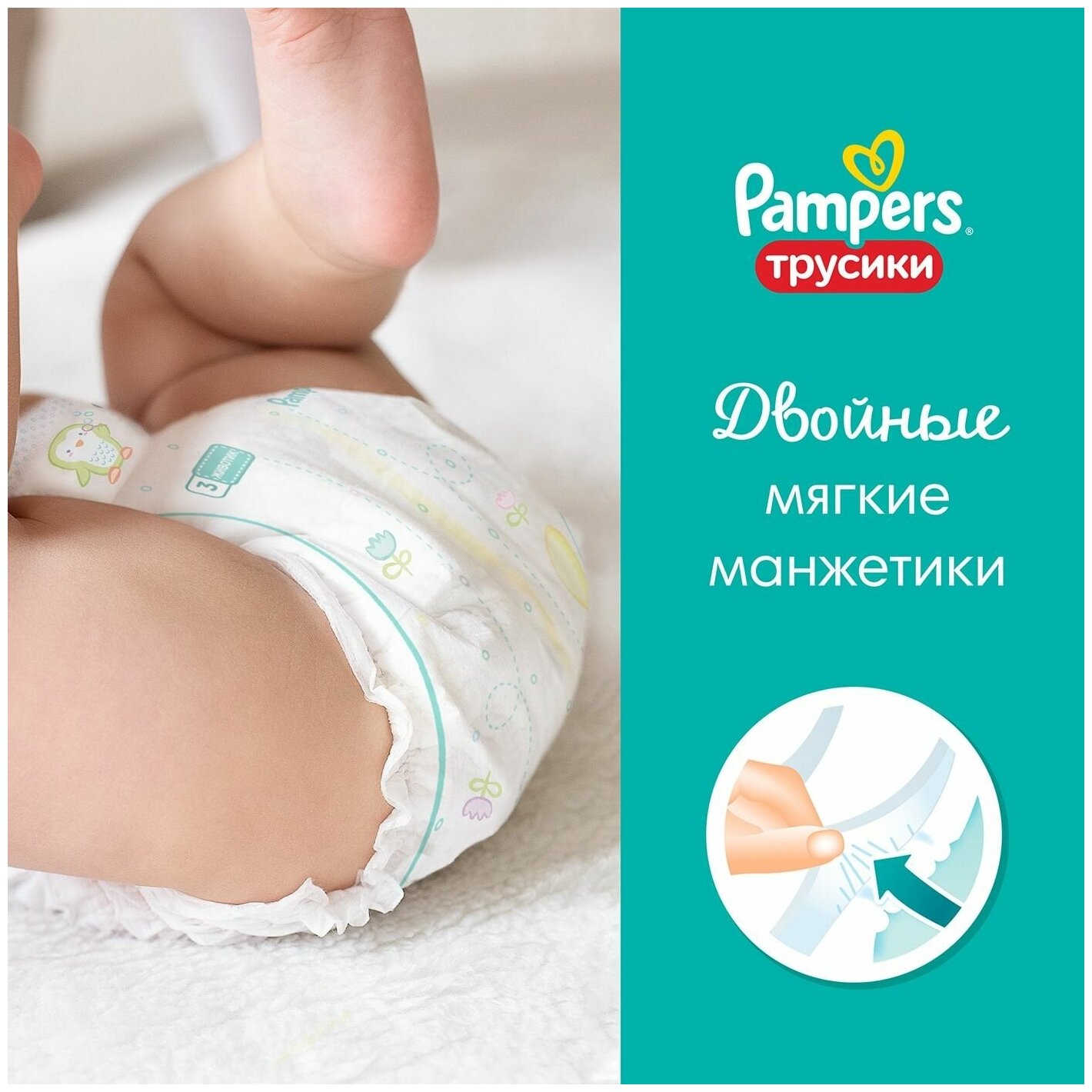 Подгузники-трусики PAMPERS Pants Extra Large,15+ кг, 44 шт Трусики Pampers с двойным впитывающим слоем и мягким, как хлопок, внутренним материалом созданы специально для защиты нежной кожи крохи. Специальные микропоры способствуют свободной циркуляции воздуха и позволяют коже Вашего малыша "дышать". Тянущийся поясок и манжеты для ножек принимают форму тела ребенка, поэтому не сковывают движений, не натирают и обеспечивают комфорт в любом положении.