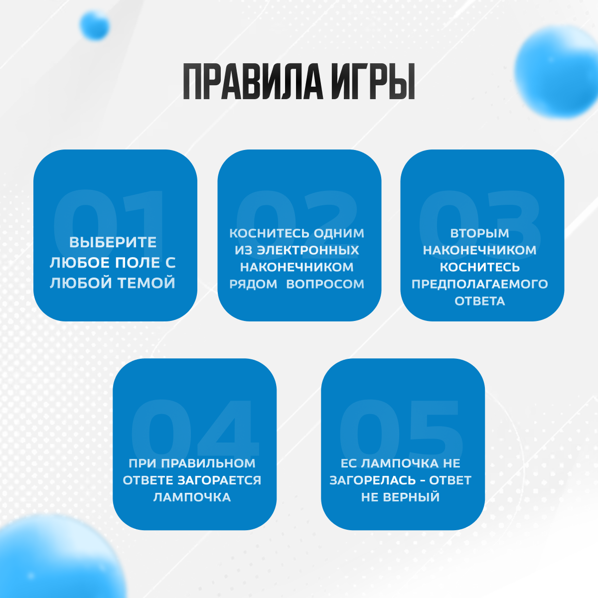 | Комплектация | система электронного контроля , 8 игровых полей содержащих 240 вопросов по 8 темам, правила игры |