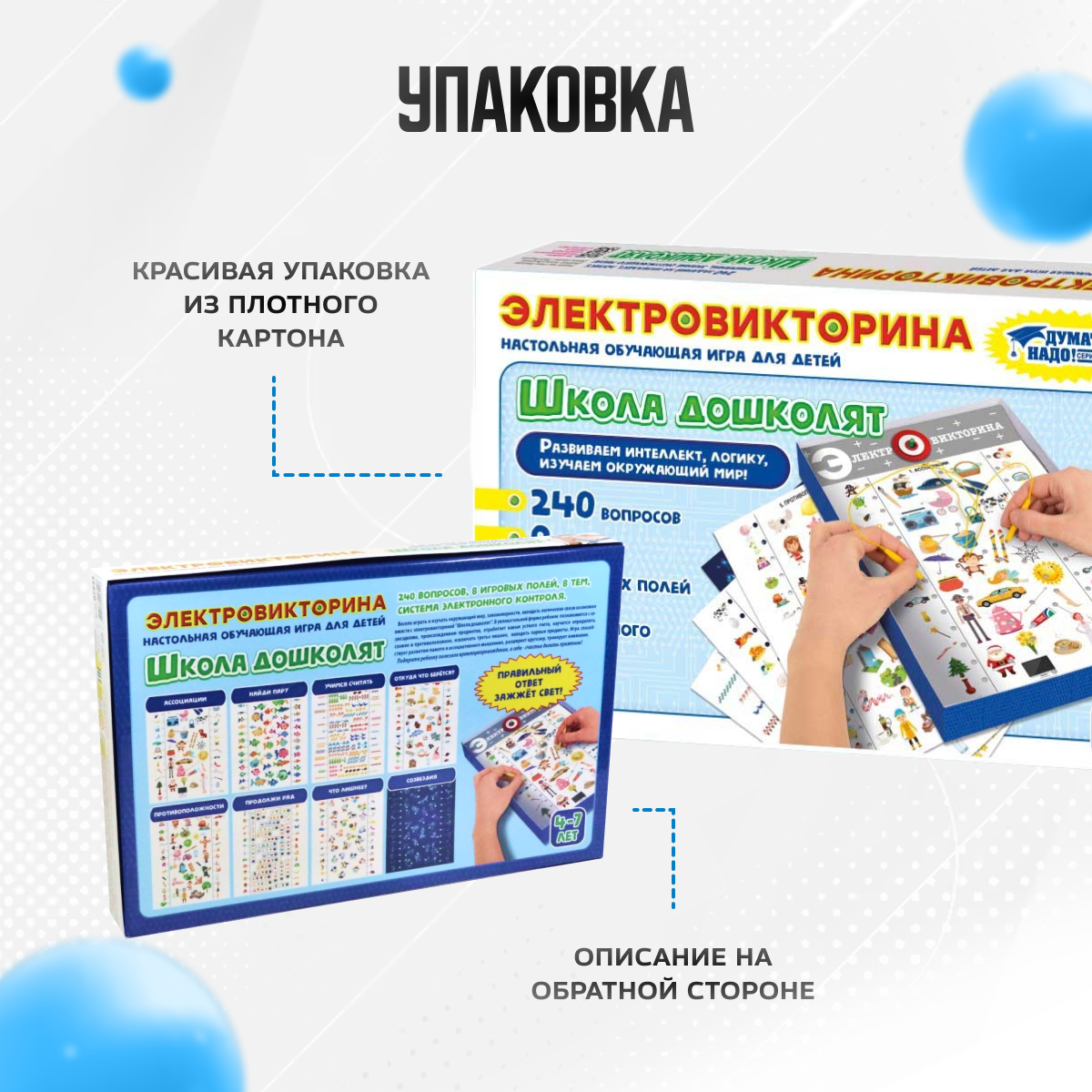 Весело играть и изучать окружающий мир, закономерности, находить логические связи возможно вместе с электровикториной «Школа дошколят». В увлекательной форме ребенок познакомится со звездами, происхождением предметов, отработает навык устного счета, научится определять схожее и противоположное, исключать третье лишнее, находить парные предметы. Игра способствует развитию памяти и ассоциативного мышления, расширяет кругозор, тренирует внимание. Благодаря системе электронного контроля ребенок может играть самостоятельно, не прибегая к постоянной помощи взрослого. Игра рассчитана на 1-2 участников и предназначена для детей в возрасте от 4 до 7 лет. Серия электровикторин «Учись, играя!» создана для обучения и развития детей дошкольного и младшего школьного возраста. В серию входят игры по темам, необходимым для подготовки к школе и успешной учебы. Поля всех игр серии подходят к электронной системе самопроверки «Учись, играя!».
