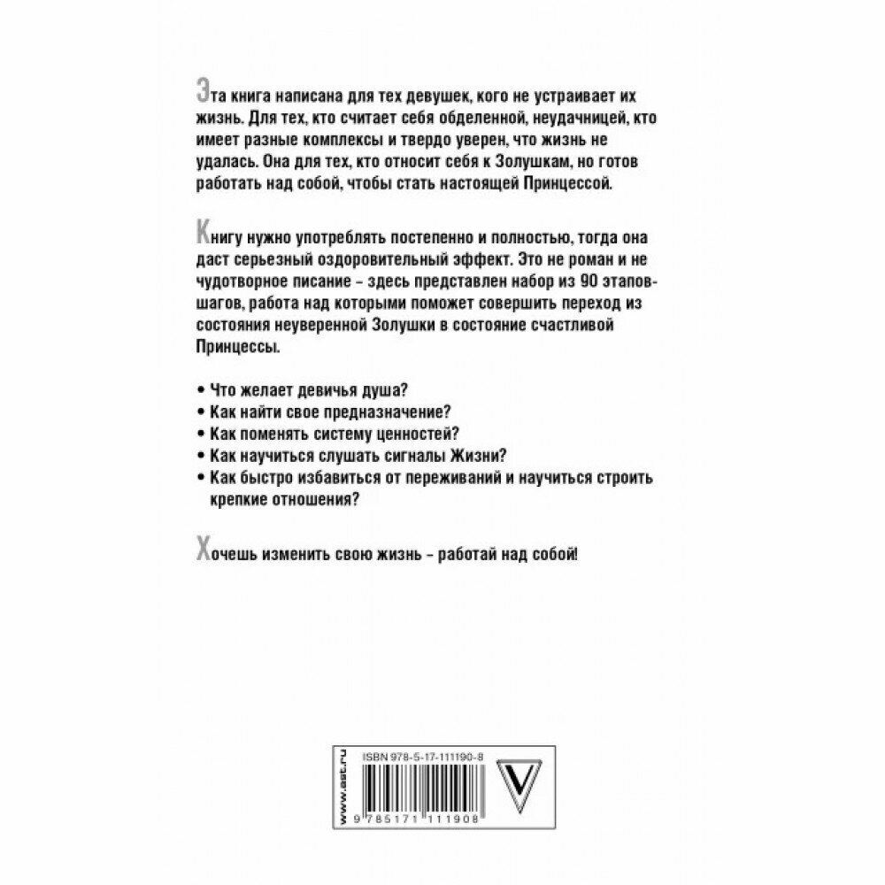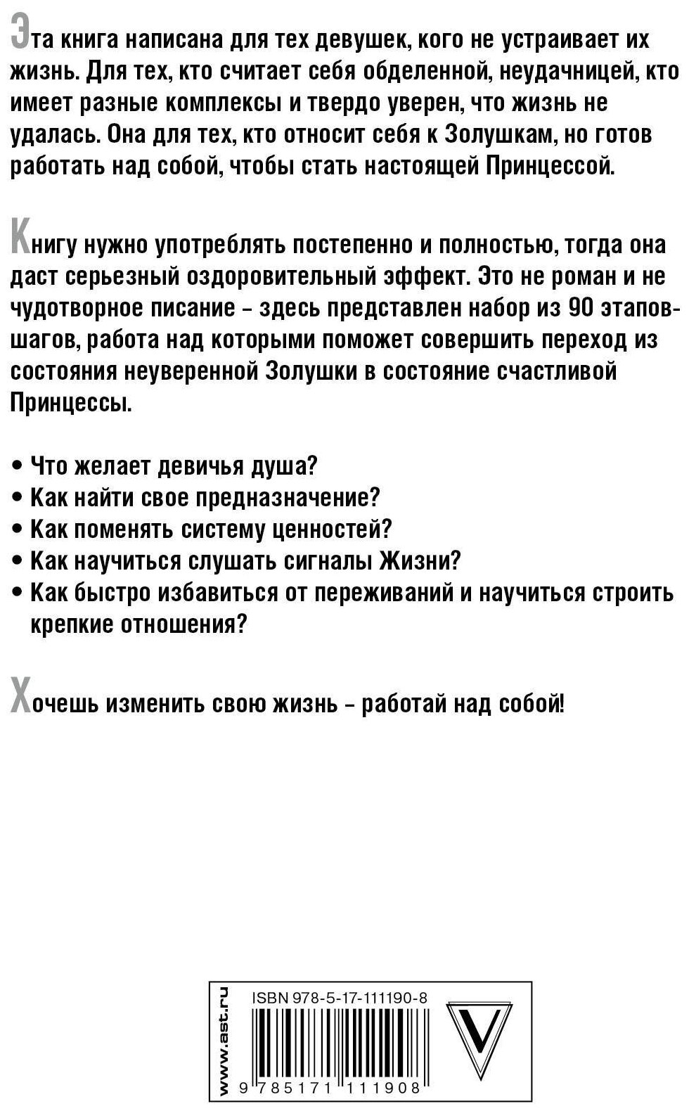 Эта книга написана для тех девушек, кого не устраивает их жизнь. Для тех, кто считает себя обделенной, неудачницей, кто имеет разные комплексы и твердо уверен, что жизнь не удалась. Она для тех, кто относит себя к Золушкам, но готов работать над собой, чтобы стать настоящей Принцессой.