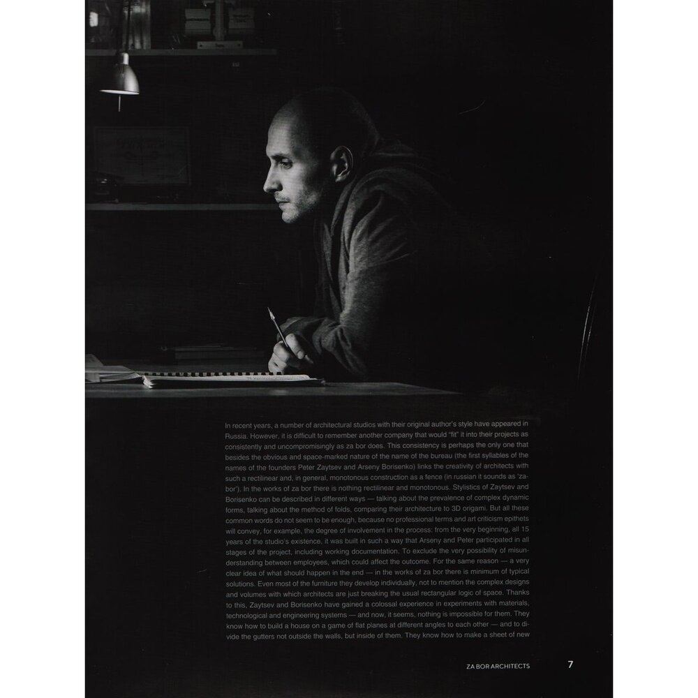 Za bor — архитектурная мастерская, основанная архитекторами Петром Зайцевым и Арсением Борисенко в 2003 году. Проекты мастерской выдержаны в современном стиле, их отличает обилие архитектурных приёмов, использованных как в объёмном проектировании, так и в дизайне интерьеров. Ещё одной отличительной чертой проектов za bor является динамичная сложная форма. В интерьере это особенно заметно, ведь почти для всех объектов архитекторы специально разрабатывают мебель и предметы обстановки. На сегодняшний день архитектурное бюро za bor имеет все необходимые допуски и лицензии и успешно ведёт международную практику. Портфолио мастерской отличается разнообразием и включает как частные дома и интерьеры квартир и апартаментов, так и объекты коммерческого назначения: офисы, гостиничные и деловые комплексы, проекты развития территории, градостроительные концепции.