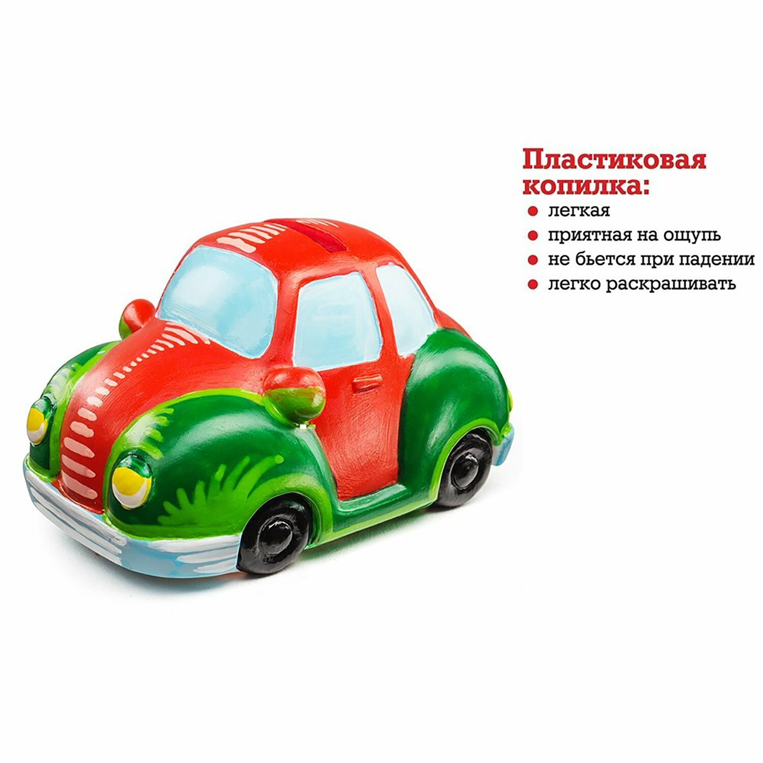 Копилка-раскраска в форме машинки надежно сохранит первые сбережения малыша, а процесс раскрашивания увлечет и подарит яркие эмоции. В красочной коробке уже есть все необходимое для творчества: копилка из пластика для раскрашивания, краски и кисточка. Копилка изготовлена из прочного пластика, на который хорошо ложится краска, и можно не беспокоиться, что ребенок разобьет ее.