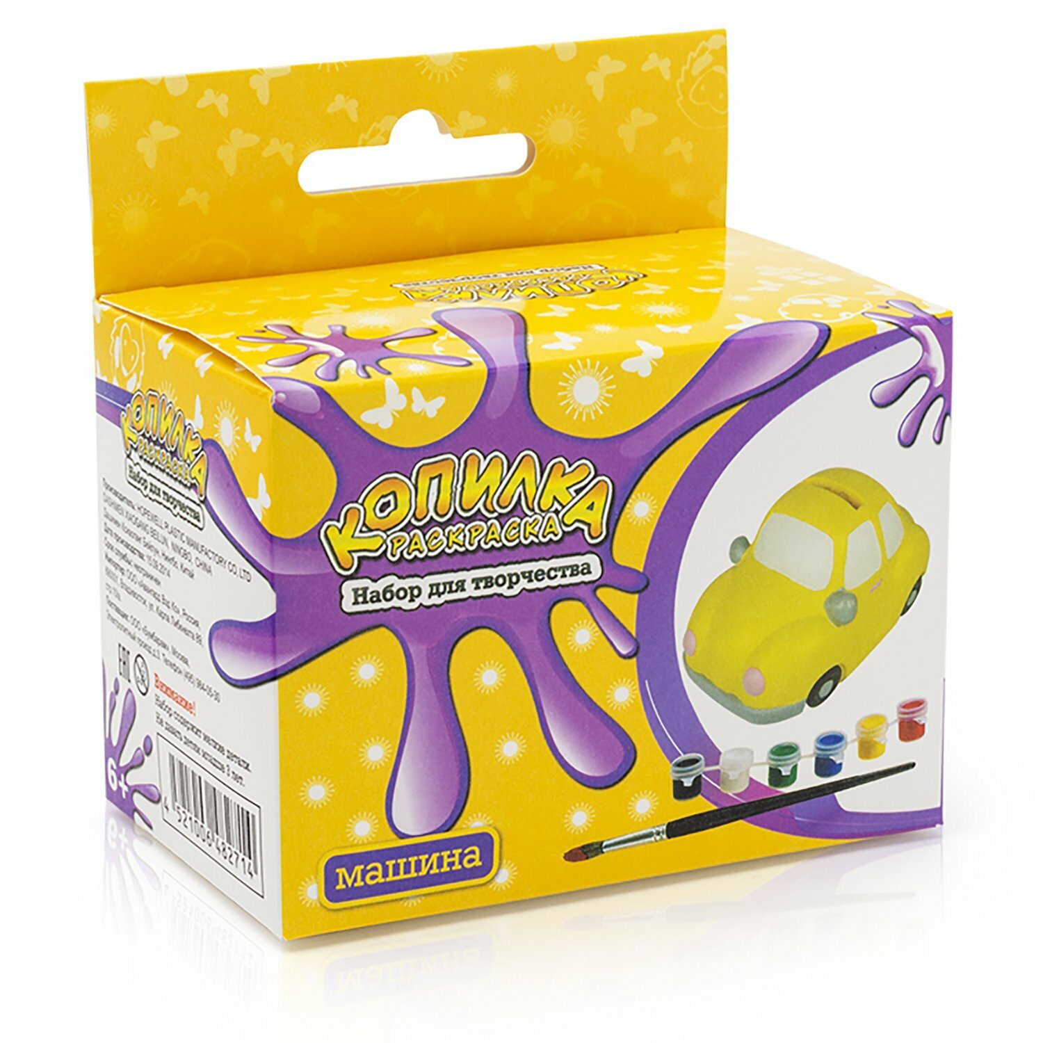 В комплекте: копилка из пластика, акриловые краски 4 цветов, кисточка.