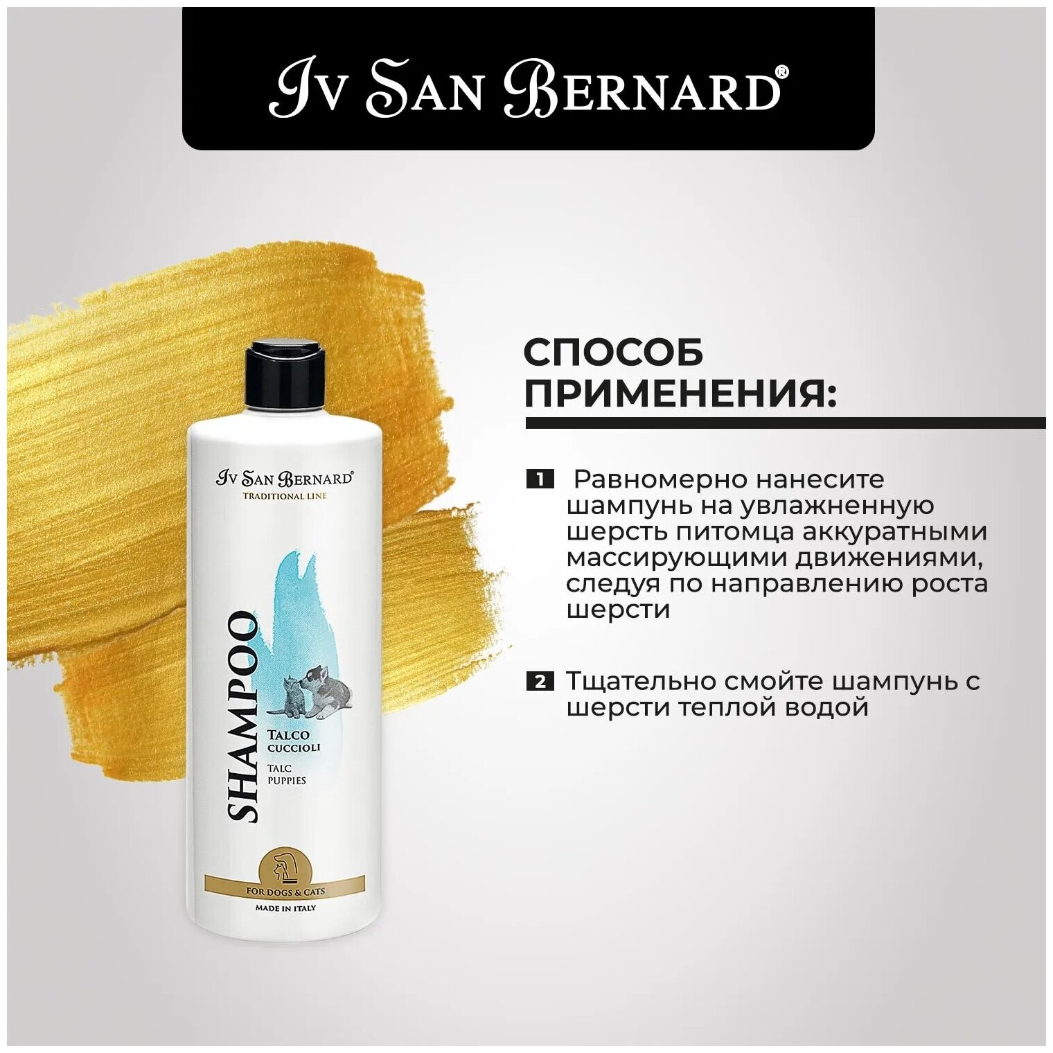 ISB Traditional Line Talc Шампунь для щенков и котят 3 л Нежный шампунь, разработанный для котят и щенков. Оставляет приятный запах тальковой пудры. Не раздражает глаза. Благодаря белкам меда устраняет патогенную микрофлору на коже. Способ применения: нанести на смоченную шерсть легкими массирующими движениями, выдержать 3 мин., смыть водой, применить кондиционер «Тальк». Шампунь «Тальк» является очень деликатным по составу и поэтому может использоваться чаще, чем обычные моющие средства. Подходит для промывания морды и ежедневной обработки лап.