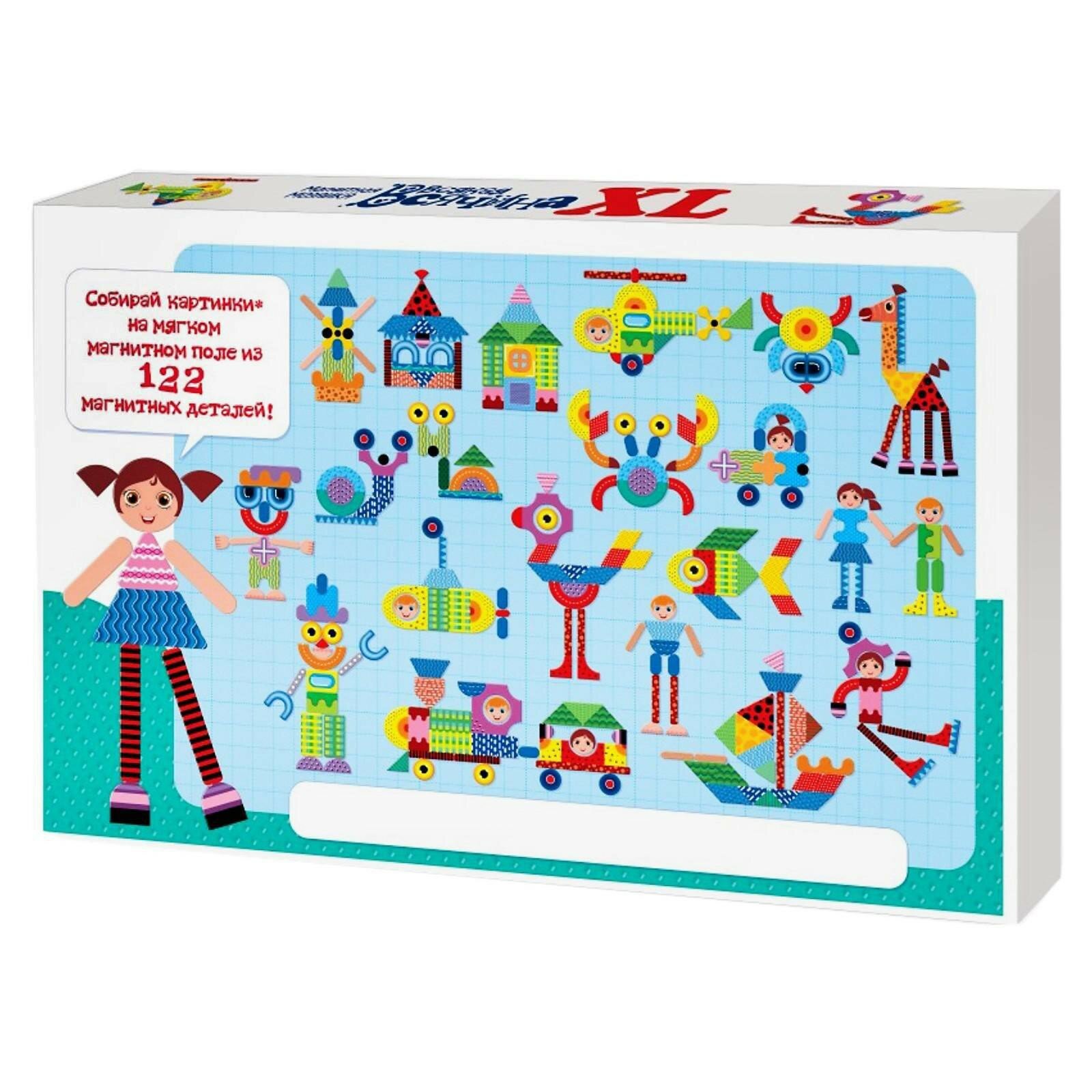 Эта магнитная мозаика является самой большой по размеру и по количеству деталей в популярной серии «Всякая всячина», поэтому в ее названии присутствует аббревиатура XL. 122 магнитные детали позволяют собрать не только фигурки, изображенные на коробке, но и предоставляет большой простор для детской фантазии, раскрывая неограниченные возможности в создании своих собственных персонажей. При этом у ребенка развиваются внимание, сообразительность и креативное мышление. Игра полностью безопасна для малышей в возрасте от 3 лет, в ней отсутствуют мелкие и металлические элементы, но тем не менее контроль со стороны взрослых не будет лишним. Состав магнитной мозаики «Всякая всячина» XL: - двухстороннее размеченное поле размером 29 на 22 сантиметра из винила и мягкого железа, - 122 элемента различной формы и расцветки из магнитного винила. Собранные фигурки удобно собирать на размеченном поле, они не рассыпаются при переноске сохраняя нервы ребенку и родителям.