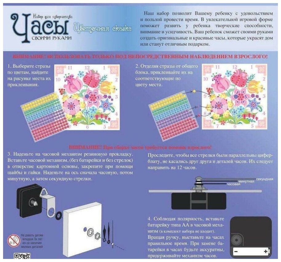 С набором для творчества «Часы своими руками. Цветочная сказка» - появляется отличная возможность провести время с пользой и сделать чудесный подарок для друзей и близких. Яркая сказочная цветочная композиция дополняется стразами, которые ребёнок наклеивает на изображение сам, развивая моторику пальчиков и воображение. Набор выпускается в красивой упаковке 22х22 см, в состав набора так же входит 182 самоклеящихся стразов пяти цветов, картонная основа для будущих часов и часовой механизм. При сборке часов ребёнку потребуется помощь взрослого – хорошая идея для совместного творчества, такое занятие понравится, как ребёнку, так и взрослому! Обратная сторона коробки содержит инструкцию, поэтому при сборке часового механизма не возникнет никаких сложностей! «Набор для творчества «Часы своими руками. Цветочная сказка» не оставит равнодушным даже самого избирательного малыша, творите вместе, создавая нарядные и красочные часы собственными руками.