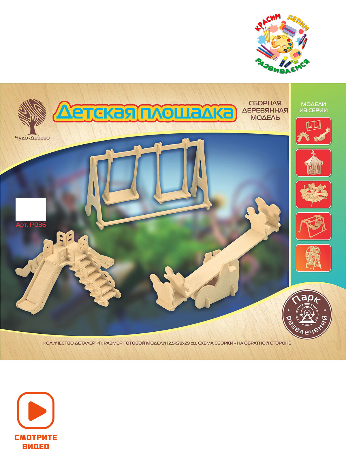 Комплект включает в себя набор деталей, вырезанных на листовом дереве (фанера), схему сборки, наждачную бумагу. Детали скрепляются в порядке и очередности, обозначенной в инструкции. Для прочности соединений рекомендуется использовать клей ПВА (не токсичен, не имеет запаха, после высыхания становится прозрачным, имеет эластичный клеевой шов, при загустевании может быть разбавлен водой).