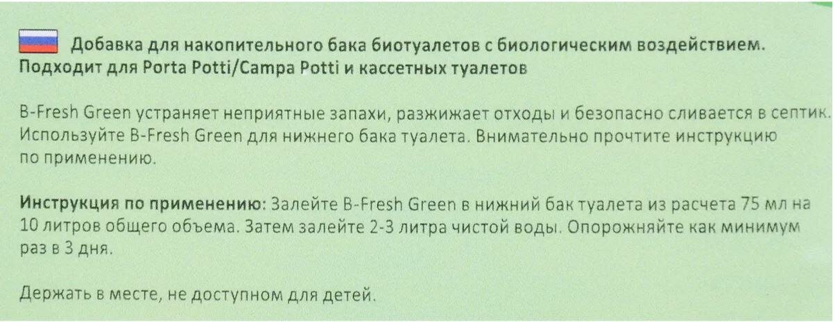 Способ применения: в емкость бака добавьте средство B-Fresh Green в соответствии со следующим расходом: