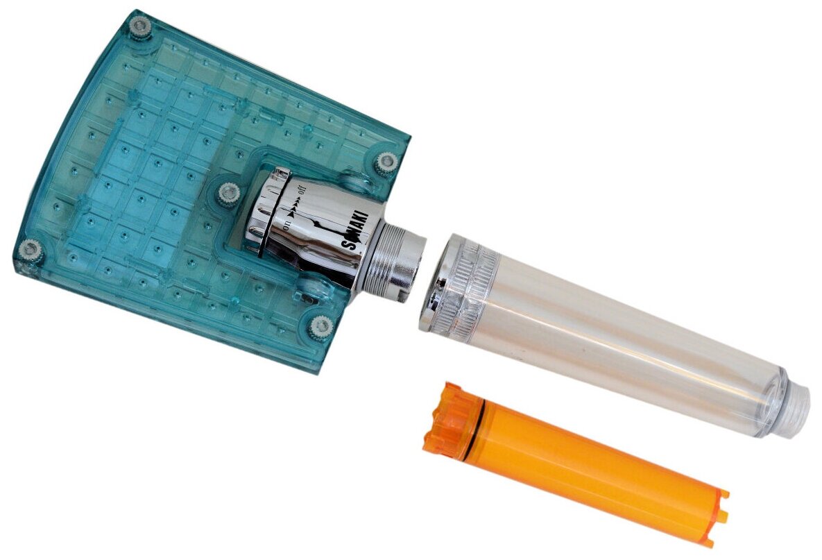 Душевая лейка с фильтром-картриджем с Витамином С мгновенно нейтрализует до 99% хлора в водопроводной воде, тем самым уменьшая раздражение кожи и замедляя накопление канцерогенов в организме человека. Прозрачная ручка душевой лейки позволяет точно определить оставшийся ресурс фильтра. Функция контроля расхода и напора воды (On ►►►►Off). Регулируемый угол наклона головки лейки. Оригинальный квадратный дизайн прозрачной головки лейки. Простота установки и компактность. Долговечность в эксплуатации. Легкость замены фильтра-картриджа. Экономия расхода воды до 50%