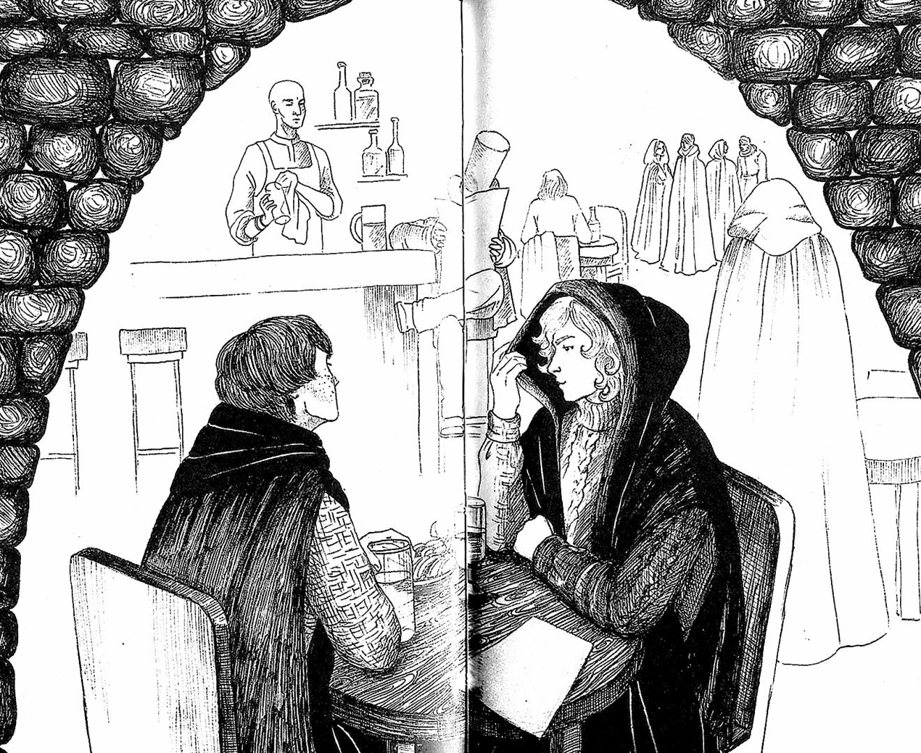 Неожиданно хорошая русская современная проза! Сначала отнеслась скептически: Марья Кощеевна?! Илья Пророк?! Муромцы?! Русалки, лешие, колдуны?! И всё это в 21 веке?! Ну-ну. Очередное жалкое подобие Гарри Поттера? Но начала читать и...не смогла оторваться. Всего историй 6, в старом издании было 6 книг, в новом будет издано 4. В этом издании сразу 3 и 4 части - "Драконья волынь" и "Русалий круг". Книга тяжёлая, толстая - 732 страницы! Они очень тонкие, газетные, увы, но при таком объёме текста это понятно и допустимо. Что выгодно отличает новое издание - авторские чудесные иллюстрации, Марина Козинаки ещё и талантливый художник. Чёрно-белые, но очень красивые, на весь разворот. Книга интересная, никогда не подумала бы, что наш русский фольклор можно так заманчиво обыграть. Истории растут вместе с героями - в каждой книге они всё старше, сюжет всё запутаннее, на каждой странице тайны и загадки. Любовные линии показаны необычайно ярко, книга живая, талантливая, необычная. Однозначно советую прочесть! Иллюстрации прилагаю.