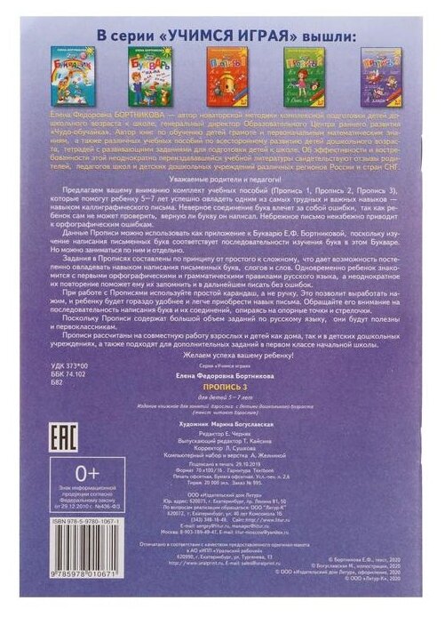 Предлагаемый комплект учебных пособий (Пропись 1, Пропись 2, Пропись 3) поможет ребенку 5–7 лет успешно овладеть одним из самых трудных и важных навыков — навыком каллиграфического письма. Неверное соединение букв влечет за собой ошибки, так как ребенок сам не может проверить, верную ли букву он написал. Небрежное письмо неизбежно приводит к орфографическим ошибкам. Данные Прописи можно использовать как приложение к Букварю Е.Ф. Бортниковой, поскольку изучение написания письменных букв соответствует последовательности изучения букв в этом Букваре.
