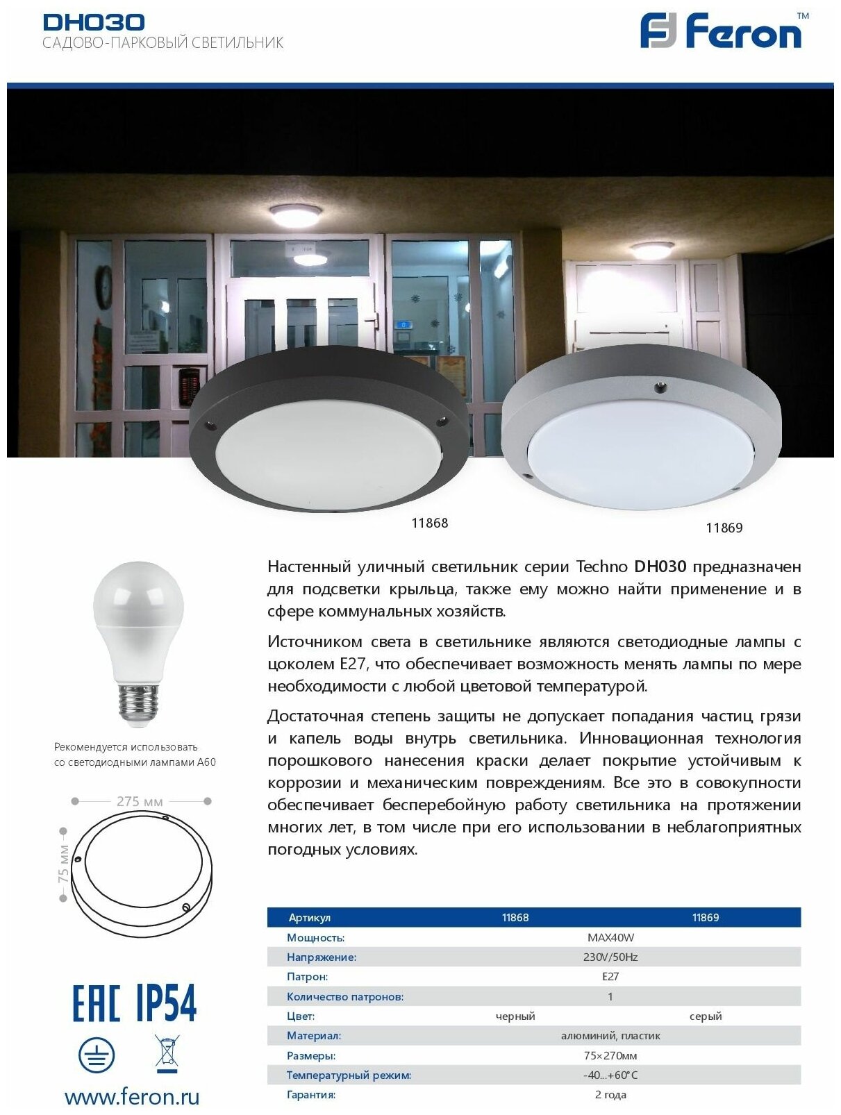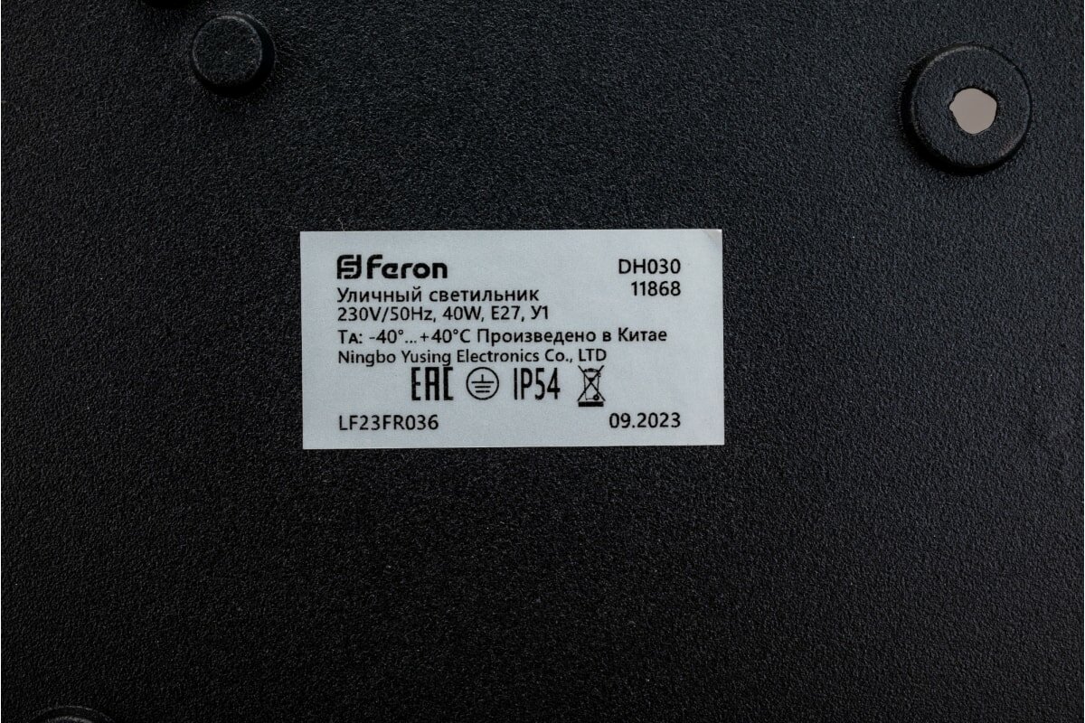 Описание светильника Feron DH030 Е27 IP54 черного:Светильник садово-парковый, серии «Техно», (НБУ) FERON DH030 40W, E27, 230V, IP54, цвет черный, на стену , 75х270х270 мм.