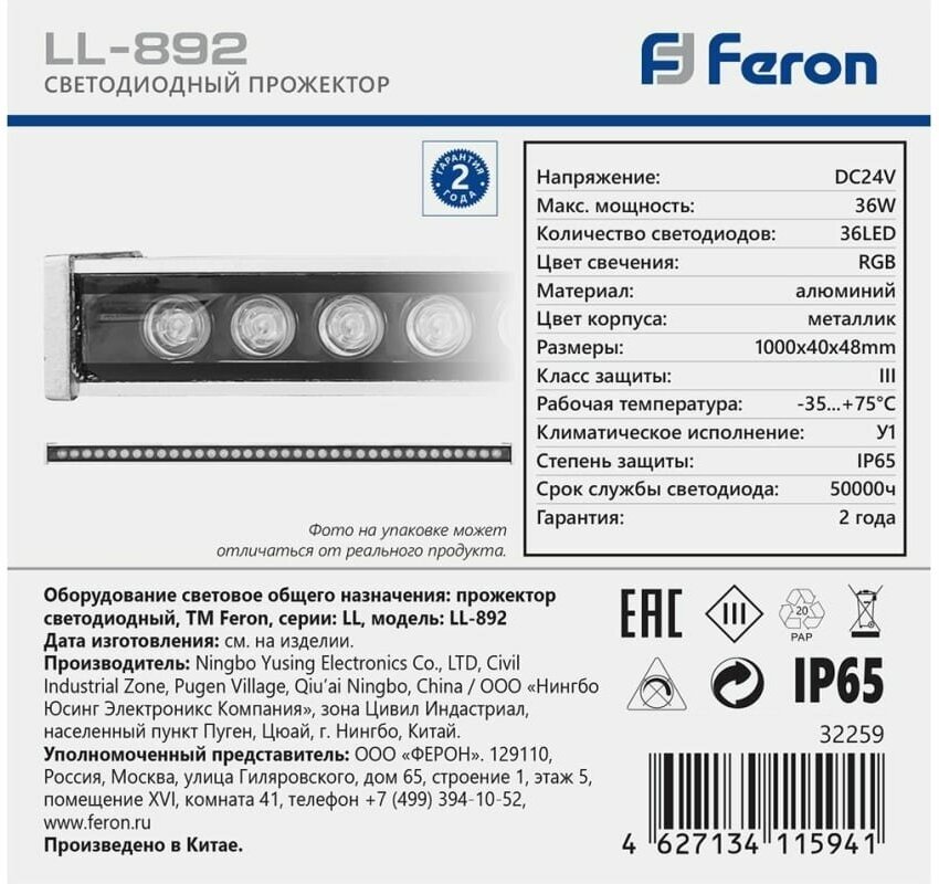 Прожектор уличный LL-892 - продукт известной компании Feron (Китай). Имеет максимальную мощность 36 Вт, освещает площадь до 7 кв. м. Отлично подойдет для таких мест, как кафе, офис, магазин, фасад. Впишется в интерьеры следующих стилей: современный.
