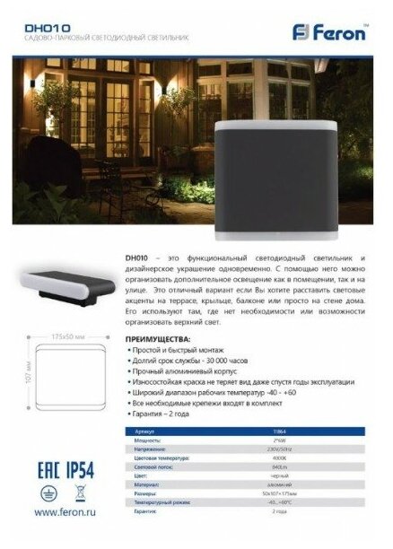 Архитектурная подсветка DH010 - продукт известной компании Feron (Китай). Имеет максимальную мощность 12 Вт, освещает площадь до 2 кв. м. Отлично подойдет для таких мест, как веранда и беседка, фасад. Впишется в интерьеры следующих стилей: хай-тек.