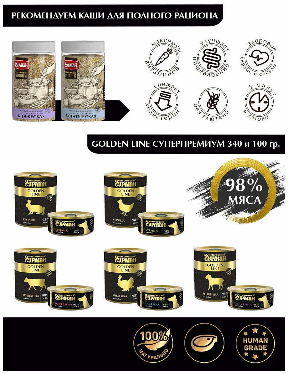 Golden line - это корм суперпремиум класса, приготовленный из одного вида мяса без добавления субпродуктов и растительных компонентов. Открыв баночку, вы увидите крупно нарезанное сочное филе в натуральном желе. Golden line – это 98% настоящего мяса и 2% желе.Корма для щенков отличаются более нежной текстурой, содержат два вида мяса и витаминно-минеральный комплекс.Мясо Golden Line отлично сочетается с моментальными кашами Четвероногий гурман.Норма кормления: 70 - 90 г на 1 кг веса животного. Суточную норму разделить на два приема кормления. Употреблять при комнатной температуре.Объем банки: 340 г
