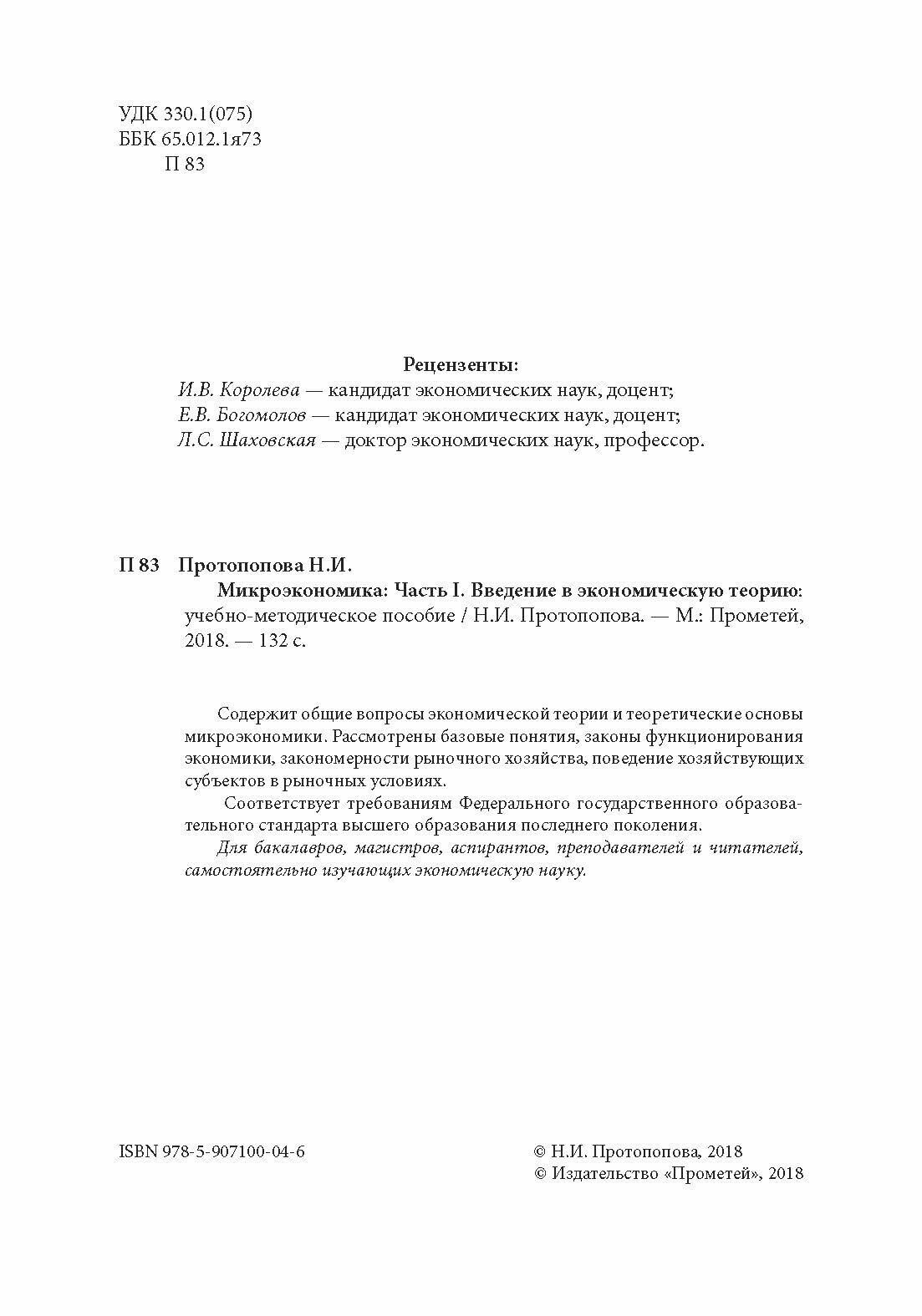 Микроэкономика: Часть I. Введение в экономическую теорию (Протопопова Наталья Ивановна); Прометей, 2018