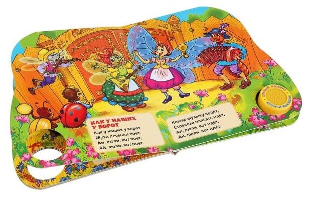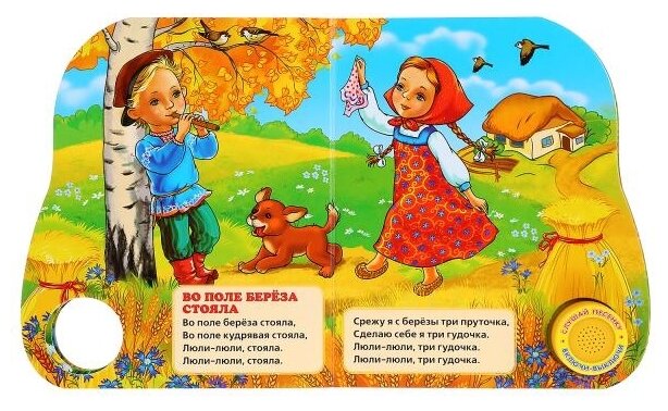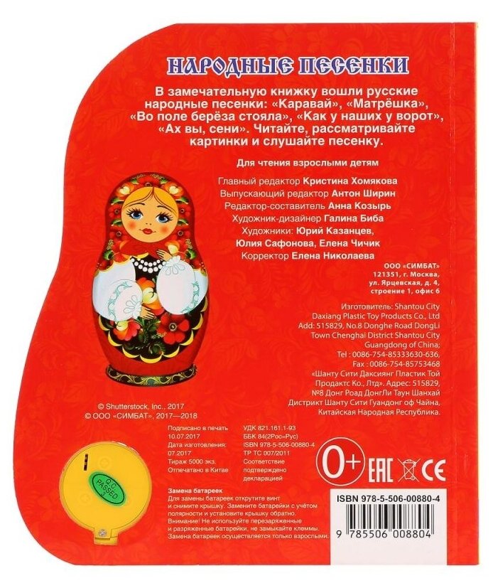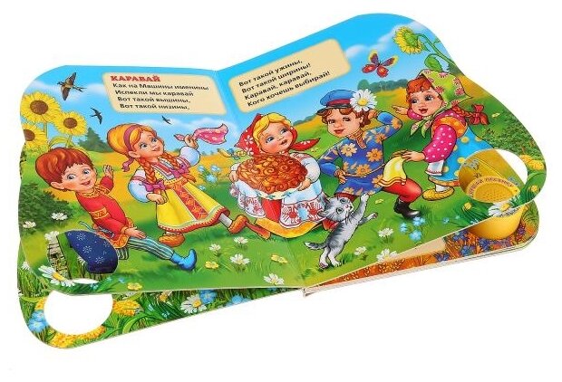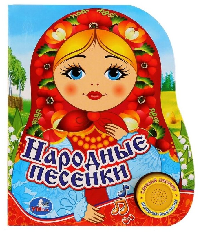 «Умка». Народные песенки. (1 кнопка с песенкой). Компактная книга «Народные песенки» из прочного безопасного картона с кнопкой для прослушивания. В этой книге помещены песни: «Матрёшка», «Каравай», «Во поле берёза стояла», «Как у наших у ворот», «Ах, вы, сени, мои сени». Малыш с удовольствием будет слушать песни и рассматривать красочные, яркие странички с героями. Если нажать на большую кнопку-модуль, то можно услышать песенку «Каравай». Развивает память, воображение. Редактор А. Козырь. Размер книги 152х185 мм. Объём 10 страниц. Рекомендовано детям от 1 года. Работает при помощи 3 батареек типа LR1130 (входят в комплект).