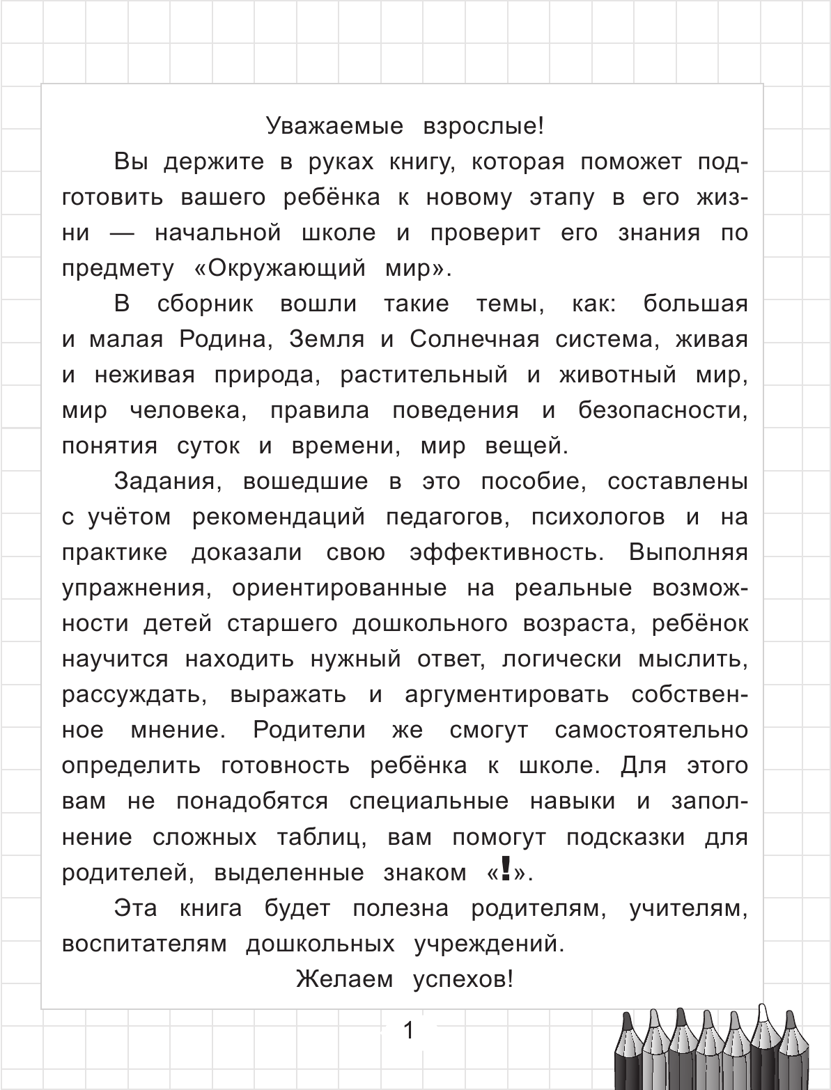 Основная цель книги, соответствующей требованиям ФГОС, - подготовка ребёнка к школе. Выполняя увлекательные обучающие задания, многократно апробированные на практике и построенные в игровой форме, будущий первоклассник повторит и углубит свои знания об окружающем мире, станет более внимательным, организованным, дисциплинированным, а главное уверенным в своих силах и позитивно настроенным к обучению.