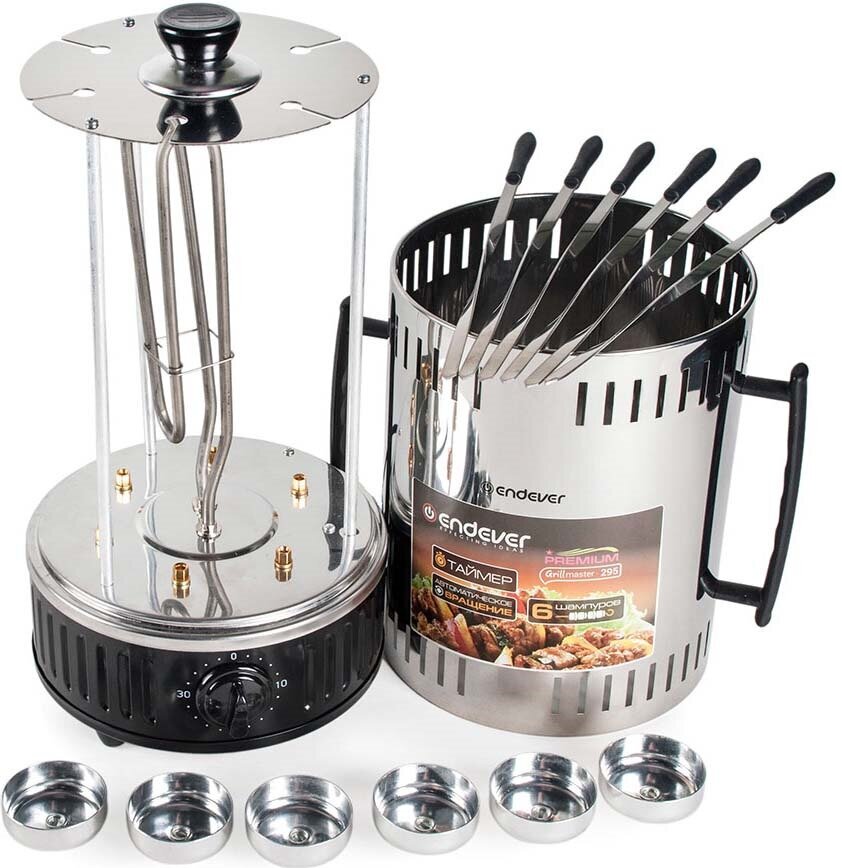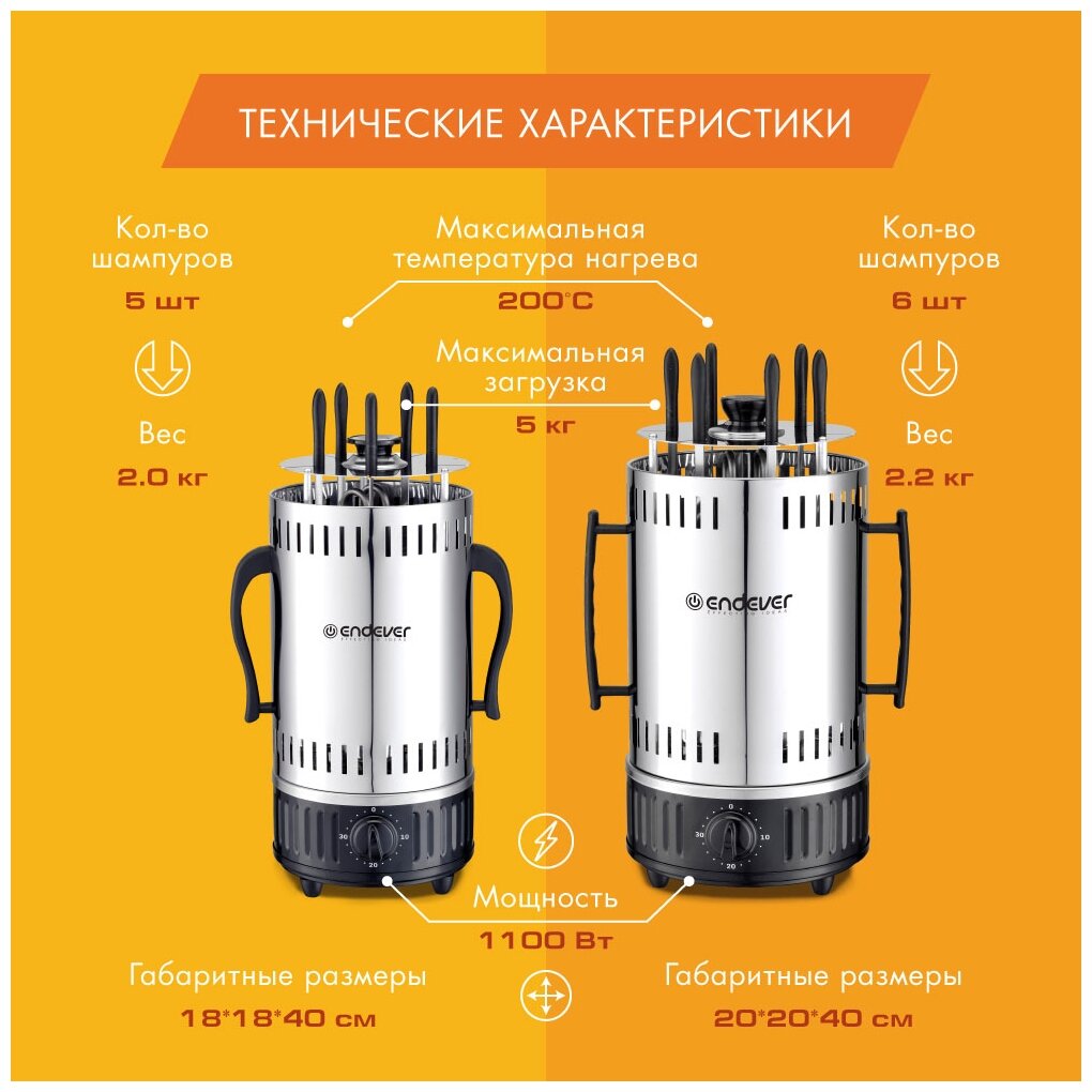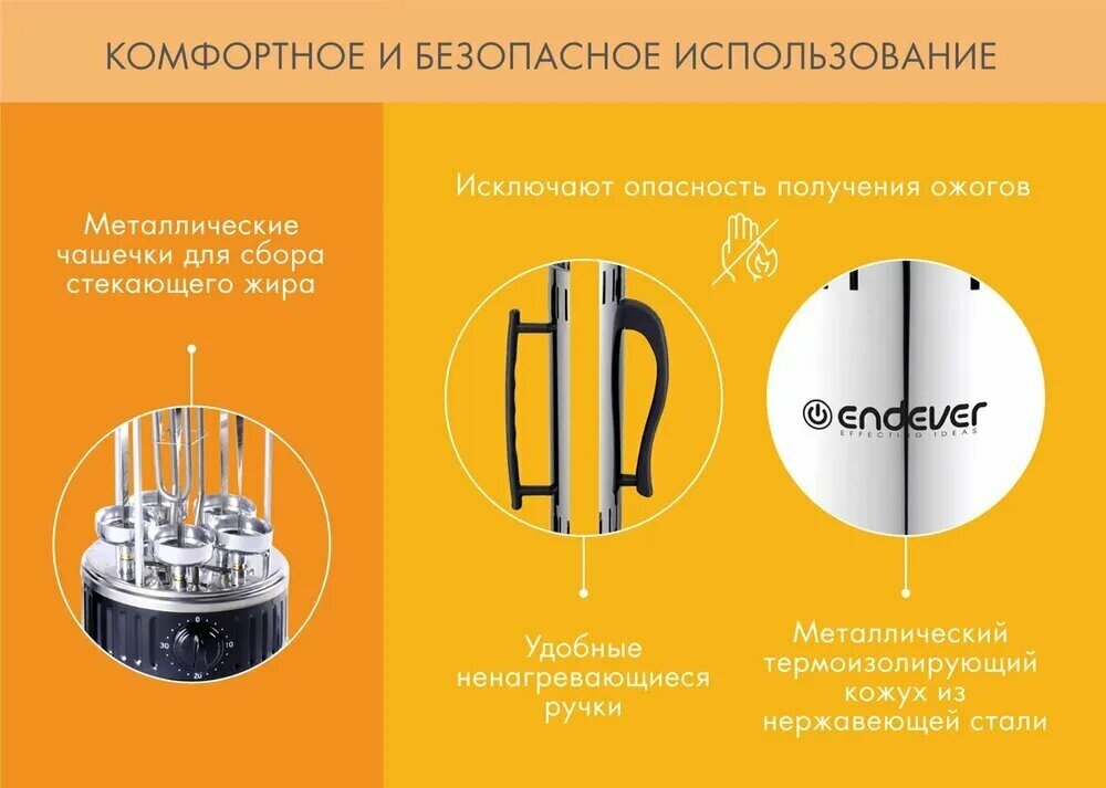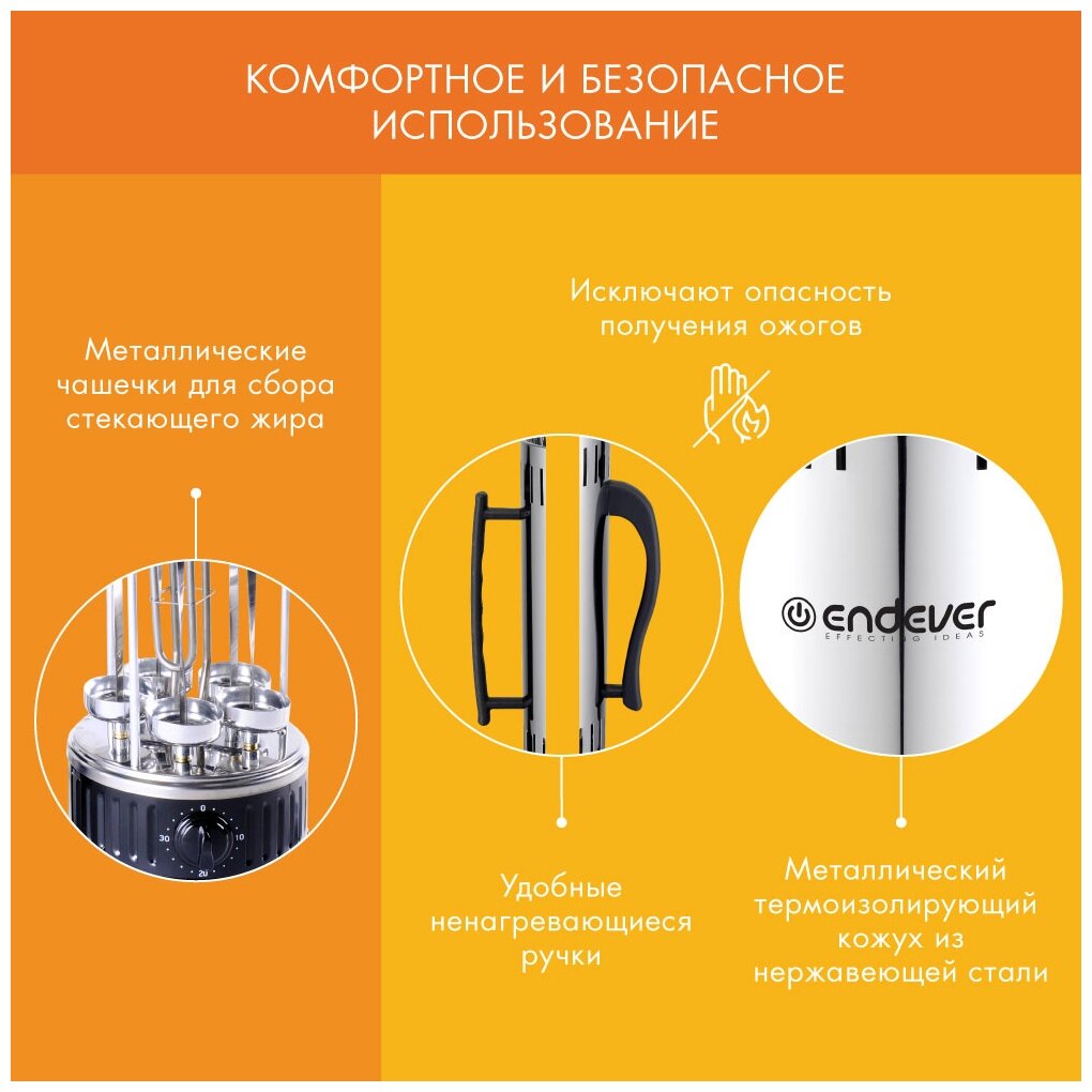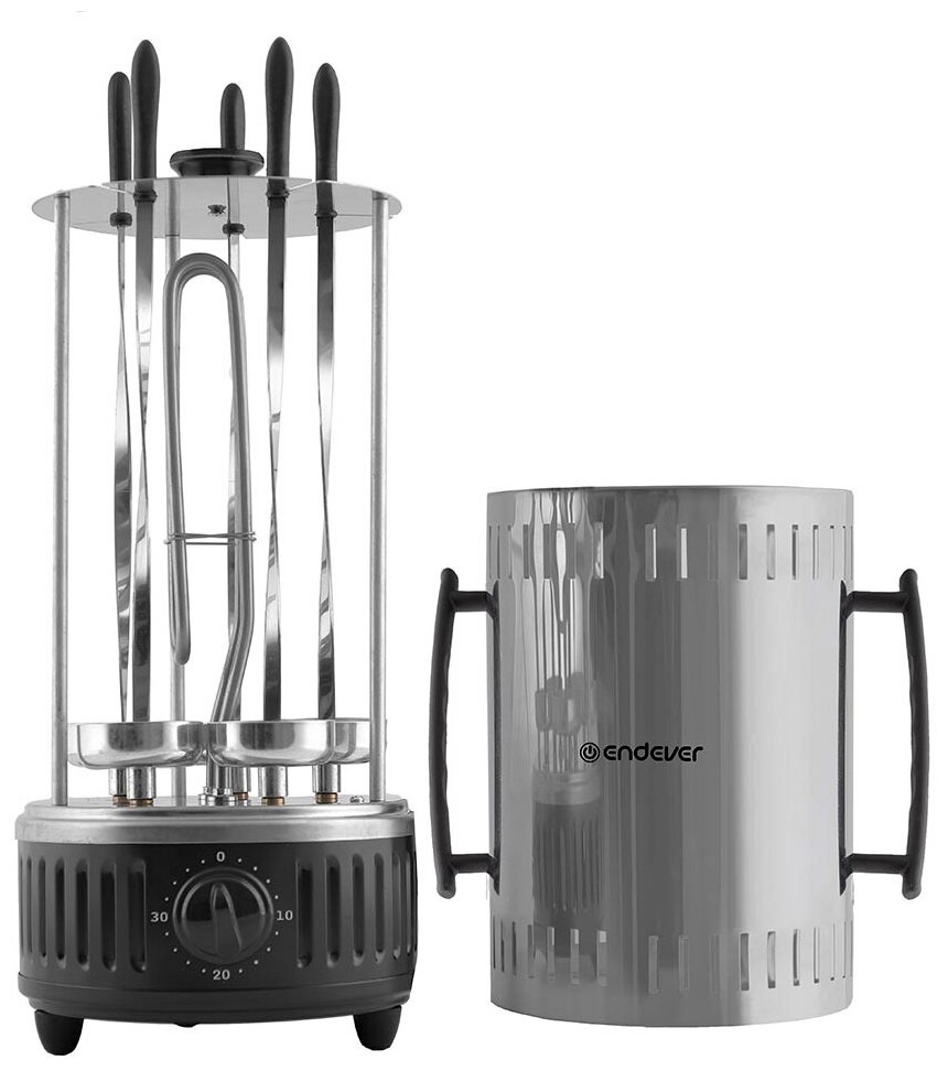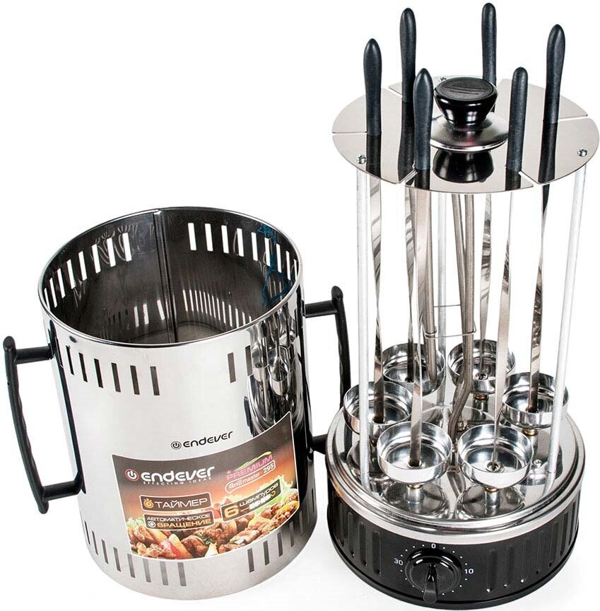 Особенности шашлычницы Endever : Корпус из нержавеющей стали. Загрузка на 6 шампуров. Таймер до 30 мин. Удобные ненагревающиеся ручки. Автоматическое вращение шампуров. Быстрое приготовление. Легкая очистка.