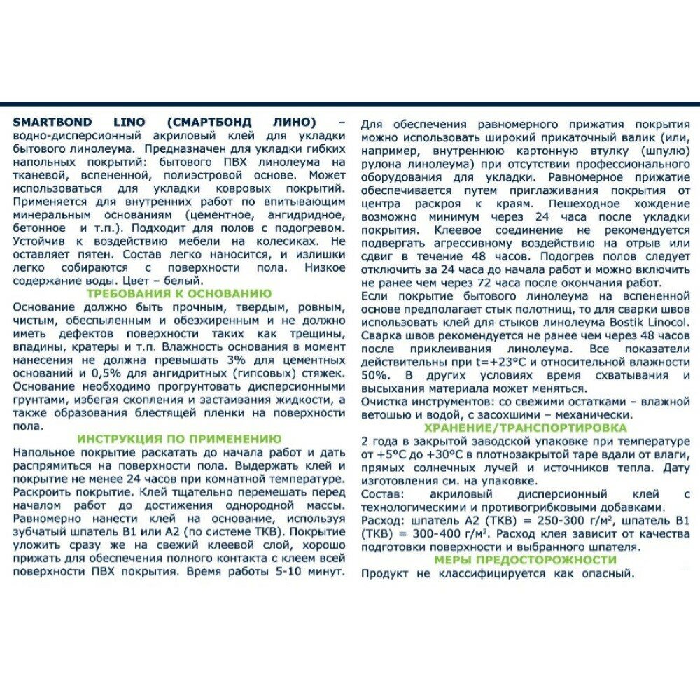 SmartBond Lino - это современный клей торговой марки Bostik для бытового ПВХ линолеума, ковролина и других гибких напольных покрытий на тканевой, полиэстровой или вспененной основе. Акриловая водная дисперсия не содержит вредных растворителей, поэтому клей не сильно пахнет. Состав может использоваться в системе теплых полов, однако не предназначен для работы с натуральным линолеумом.