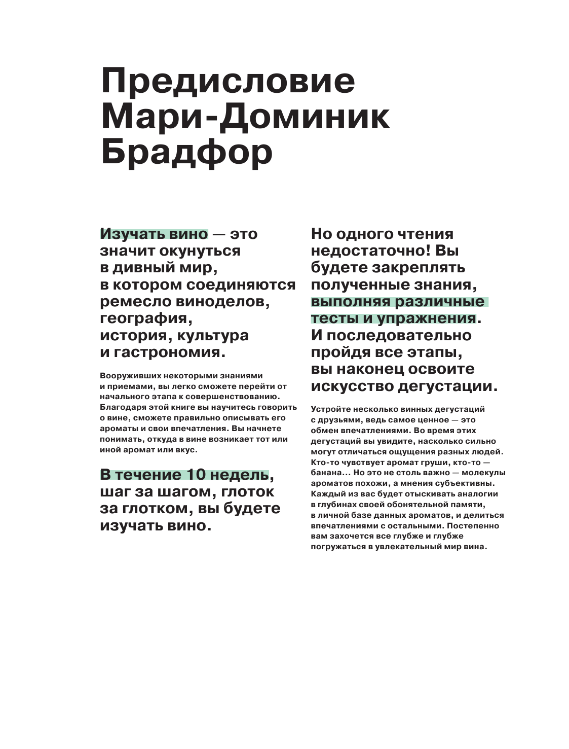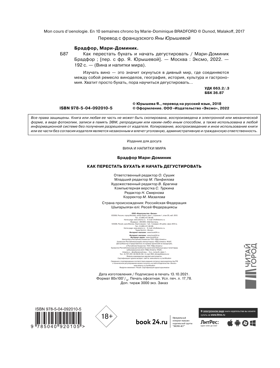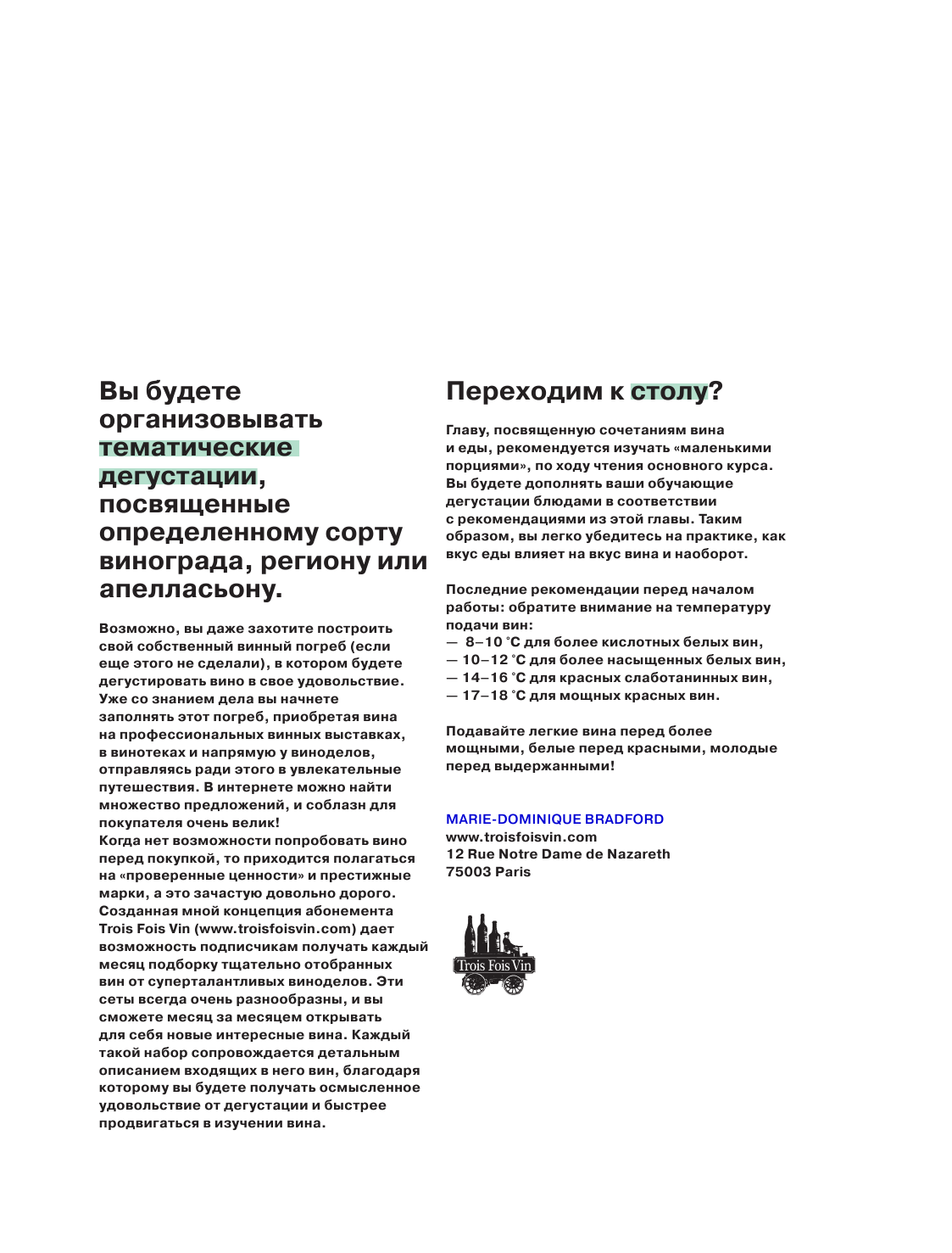 Ты чувствуешь, что тебе больше не достаточно просто оценивать вкус и терпкость выпитого вина? Что-то в тебе переломилось… Однажды ты проснулся и понял… нет, не то, что больше никогда в жизни не будешь пить, а то, что хочешь овладеть искусством дегустации, говорить о винах, чувствовать вина, выбирать их. За 10 недель Мари-Доминик Брадфор, энолог и основательница Trois Fois Vin, предлагает тебе пройти увлекательный и познавательный курс энологии. - 4 главы, позволяющие открыть для себя вселенную винной дегустации, изучив сорта винограда, винодельческие регионы и основы сочетаемости блюд и вин. - 38 уроков, сопровождаемых разнообразными иллюстрациями, упрощающими понимание базовых основ. - 90 заданий с ответами - от самых простых до самых сложных, для проверки полученных знаний и закрепления пройденного материала. - Упражнения по дегустации - для тренировки, в одиночку или с друзьями, и получения еще большего опыта в искусстве дегустации.