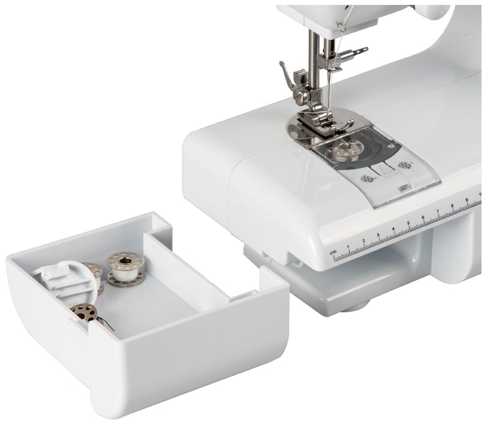Двухниточная швейная машина VLK будет удобна и опытным, и начинающим портным. Она выполняет 19 видов строчек, среди которых прямые, зигзагообразные, обмёточные и одна петля (полуавтомат). Функция Реверс (обратный ход) позволит надёжно закрепить шов. Постежковый ручной режим поможет аккуратно проработать сложные элементы. У прибора простое и надёжное электромеханическое управление. Регулируйте длину стежка (максимальная 4 мм), уровень натяжения нити, скорость шитья. Положение иглы позиционируется вручную. Изменяется степень нажима лапки на ткань, что даст возможность работать и с тонкими, и с плотными материалами. Нить на шпульку наматывается автоматически, есть встроенный нитеобрезатель. Заниматься мелкими деталями поможет LED-подсветка. Вместе с машиной вы получите набор полезных аксессуаров: иглу, шпульки, ручной нитевдеватель. Хранить швейные принадлежности будет удобно в специальном отсеке, расположенном в корпусе. В комплект входит и ножная педаль с прорезиненными ножками для предотвращения скольжения. VLK весит чуть менее 3 кг, её легко перевозить и переставлять с места на место, для этого есть встроенная ручка.