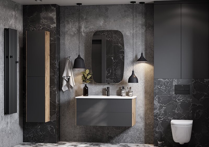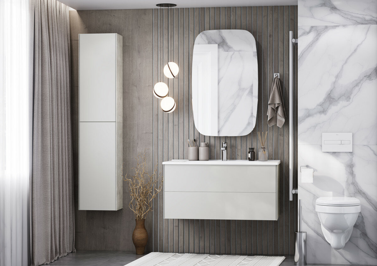 Подвесной вариант модели ЭКЛИПС предназначенный для совсем небольшого пространства – подвесная тумба с белыми глянцевыми накладками. Благодаря им фасад легко открывается без ручки, что дополнительно экономит место в санузле.