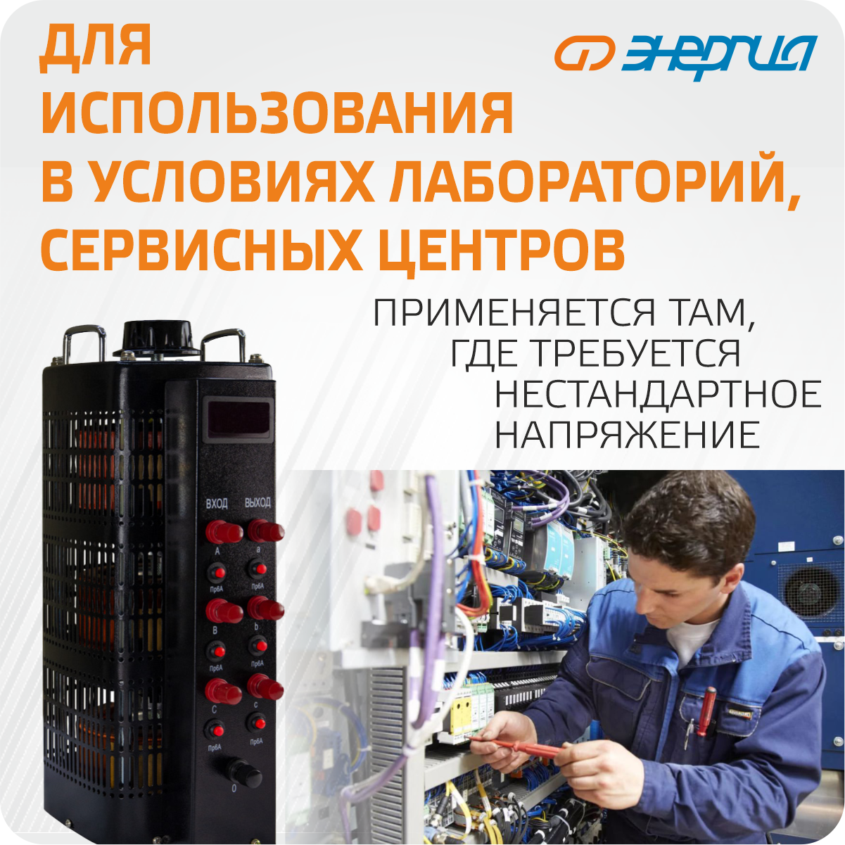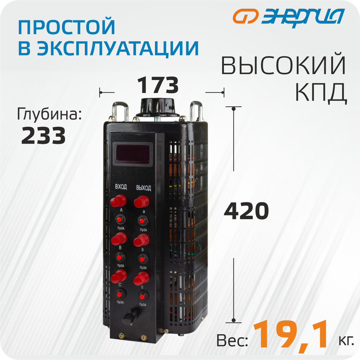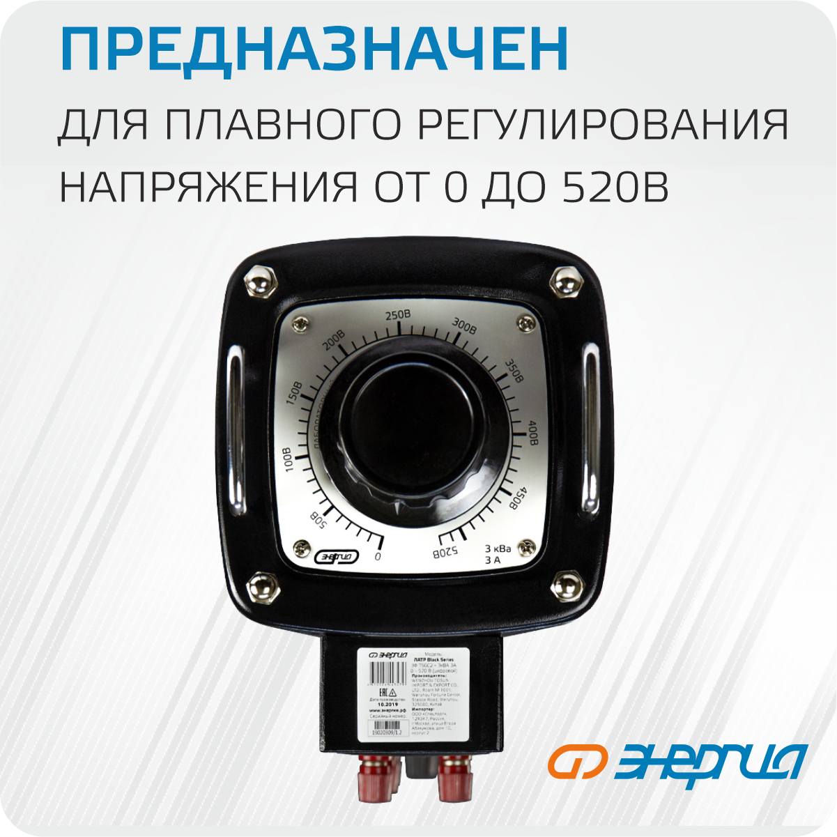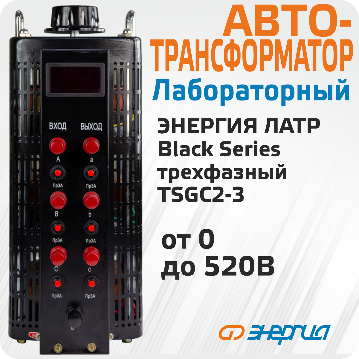 Энергия Black Series TSGC2-3кВА 3А - регулируемый трехфазный автотрансформатор (ЛАТР) с выходным напряжением от 0 до 300 В и максимальной мощностью 3 кВА. Специальная серия аппаратуры черного цвета.