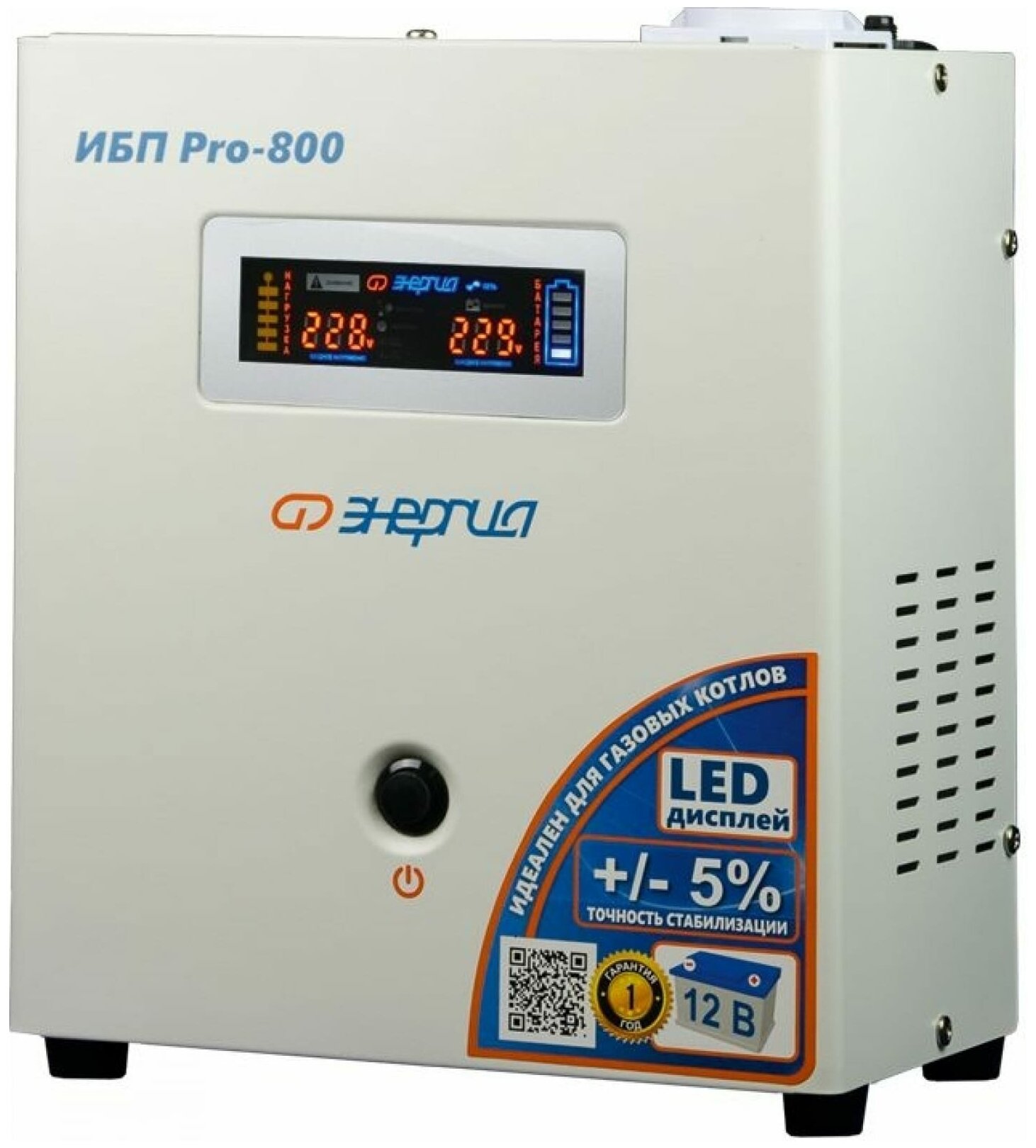 Источник бесперебойного питания Энергия ИБП Pro-800 12 V относится к типу Line-interactive с внешним подключением аккумулятора. Обеспечивает надежную защиту подключенных электроприборов, например, газовых котлов, от перепадов напряжения в сети или автономную работу в случае пропадания электричества. Чем больше емкость подключенной АКБ приобретается отдельно , тем дольше будут работать потребители.